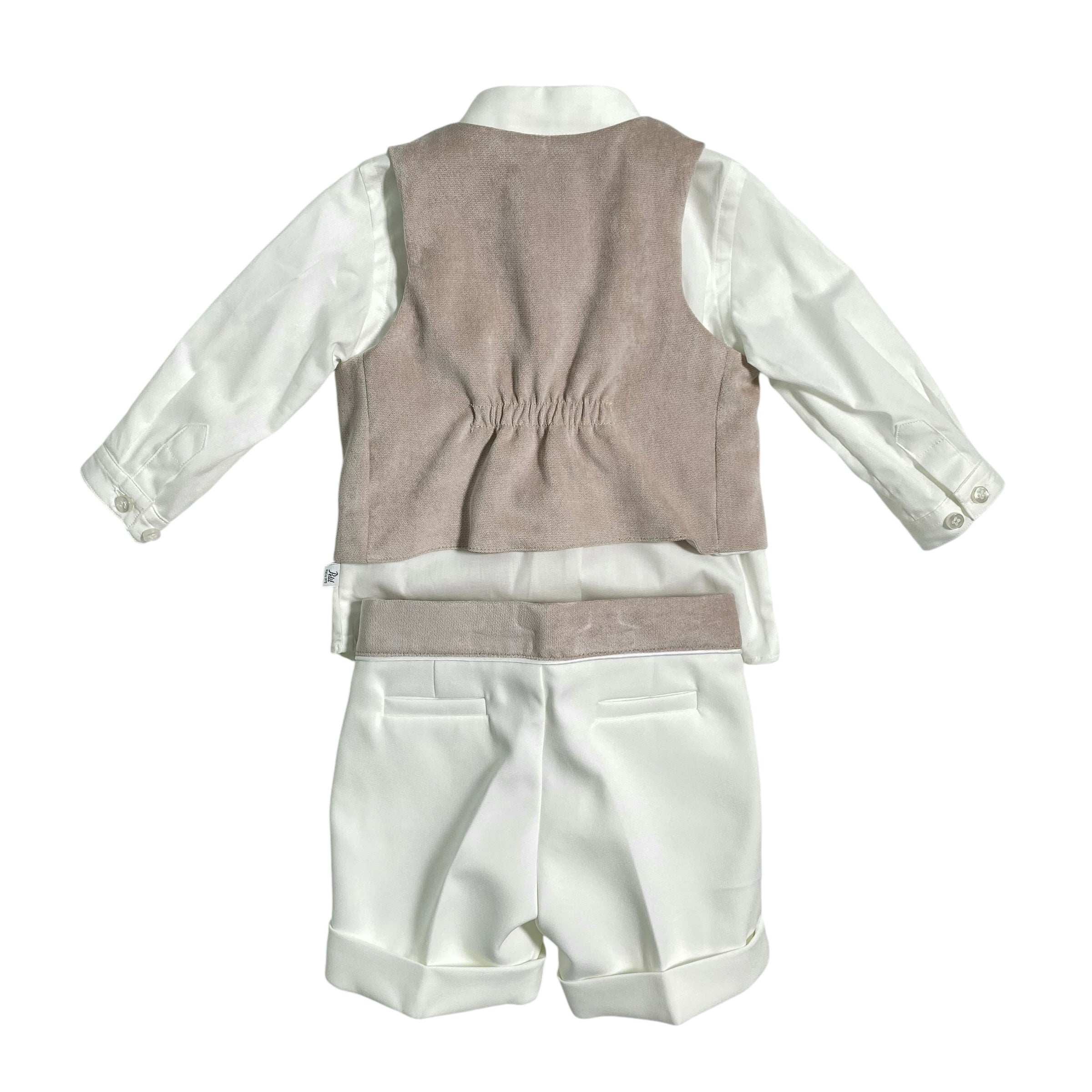 Rendi speciale ogni momento con il completo elegante in raso e velluto per neonato PETIT. Il pantalone corto in raso con fascia in velluto, camicia manica lunga, panciotto e papillon in velluto e raso, rendono questo outfit elegante e raffinato per il tuo bambino. Ottimo per occasioni speciali.