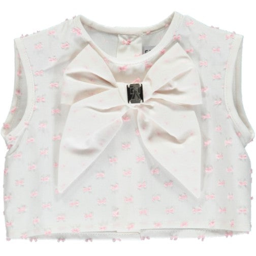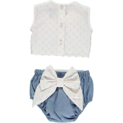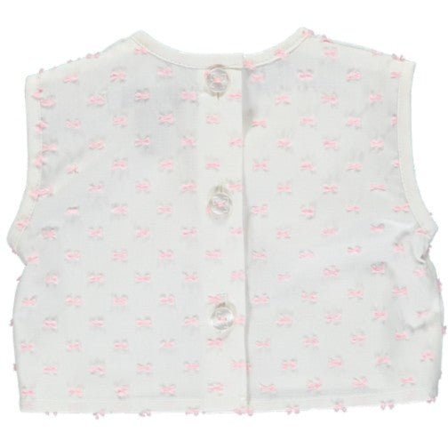 Cotton Suit Consisting Of Sleeveless Shirt In White / Pink Plumetis With Big Bow In Front. Closure With Buttons On The Back.