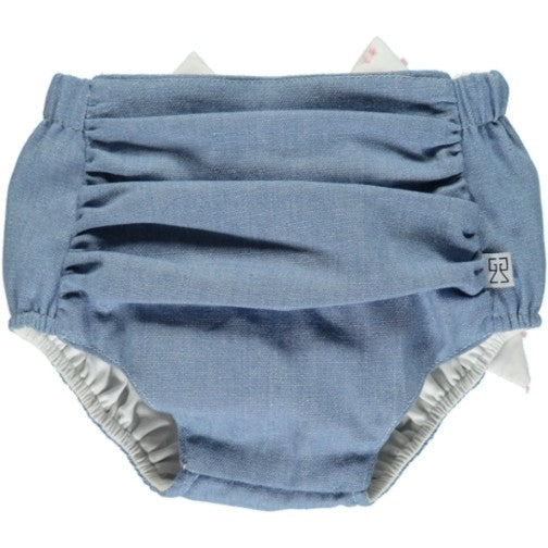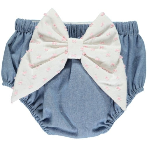 Denim Culotte With Plumetis Bow On The Back Equal To The Shirt. Elastic waist on the back. Curled On The Front. Lined internally in Cotton
