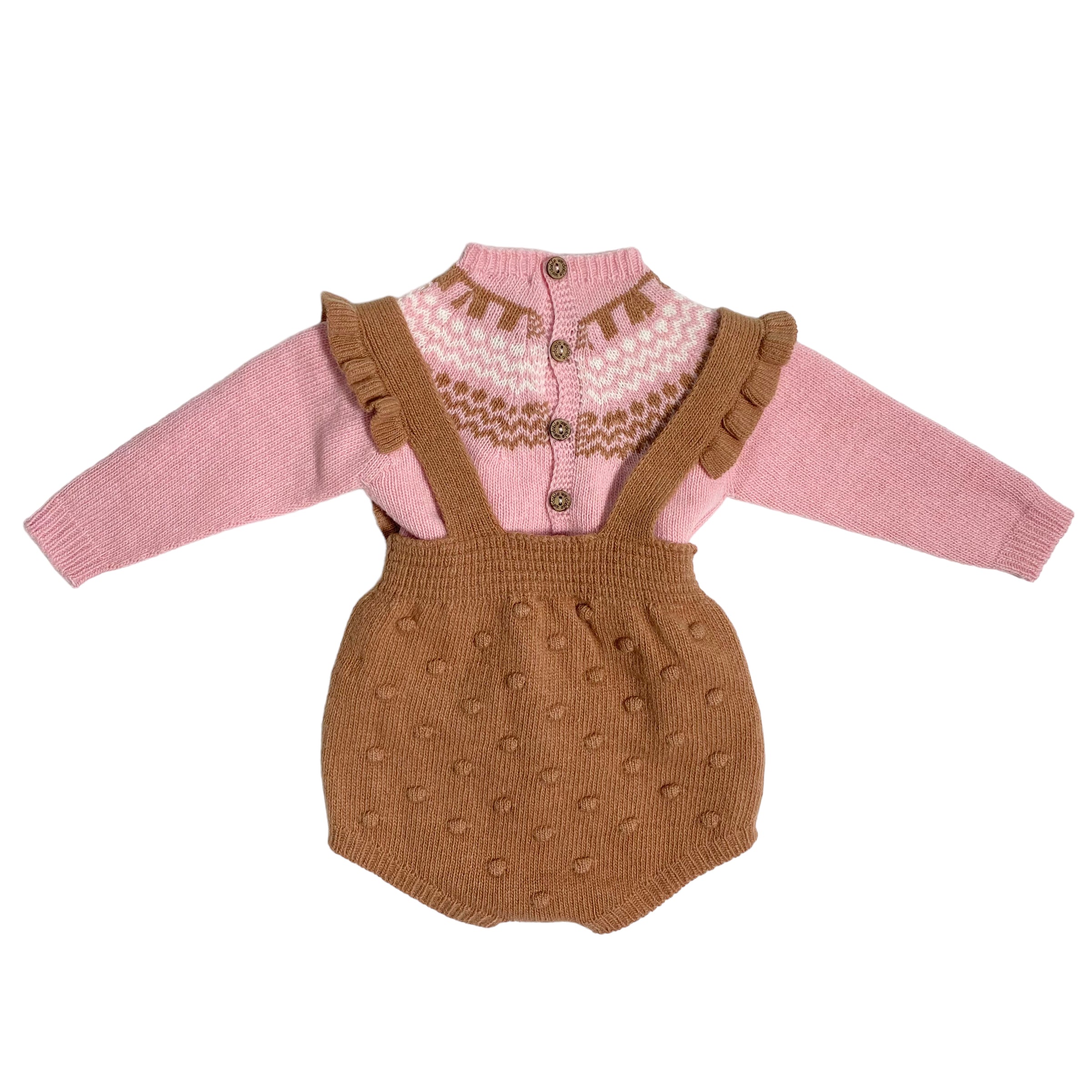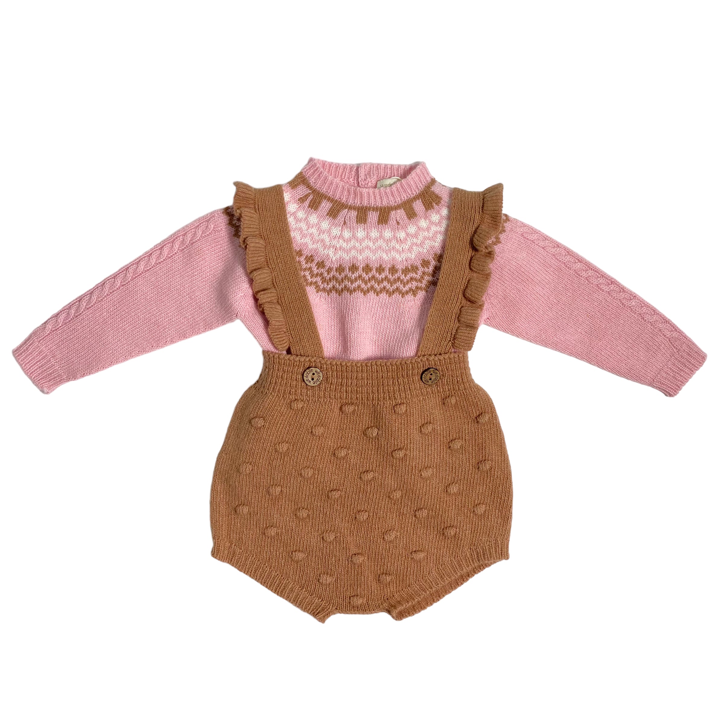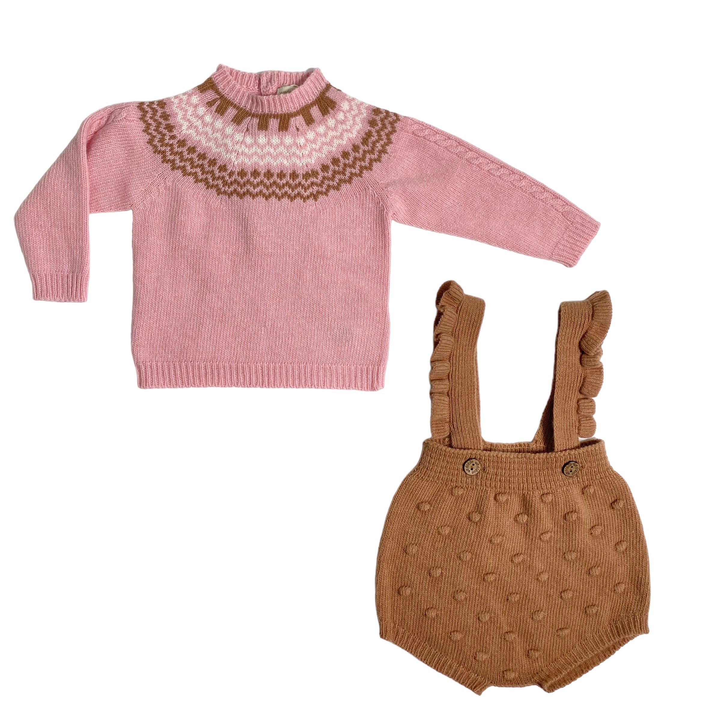 Completo in lana e cashmire composto da salopette corta con poise a rilievo e maglioncino con fantasia jacquard sul davanti.