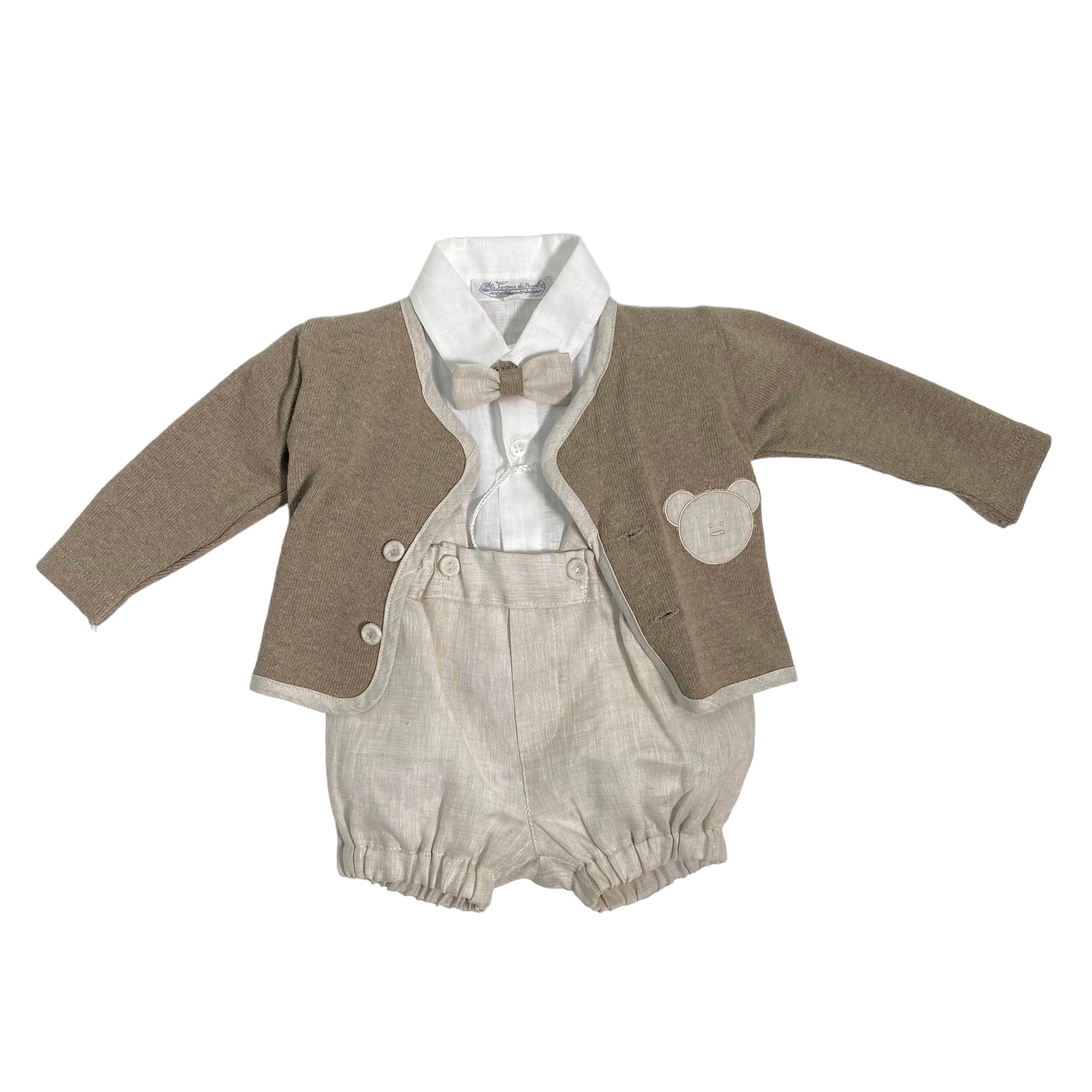 Cotton cardigan of a dark beige and some details of buttons on the front for the opening and on the outline of it in light beige. It takes up the colors of the bow tie. A beautiful teddy bear design on the left side of the cardigan
