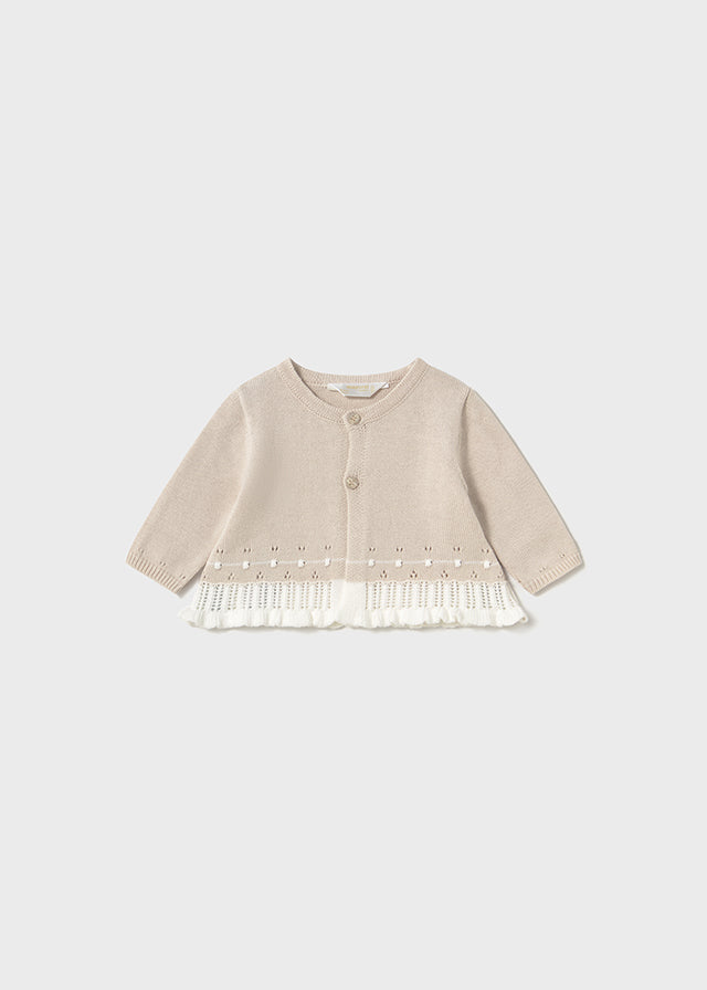 Cardigan manica lunga per neonato. Chiusura con bottoni nella parte anteriore. Tessuto in tricot morbido al tatto. Design con volant nella parte bassa.