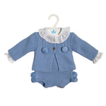 Questo completo tre pezzi in tessuto anallergico è composto da un pagliaccetto, una camicia con collo volant in cotone e un cardigan con bottoncini in legno. Perfetto per l'uscita clinica, è alla moda e garantisce comfort e sicurezza per il neonato.