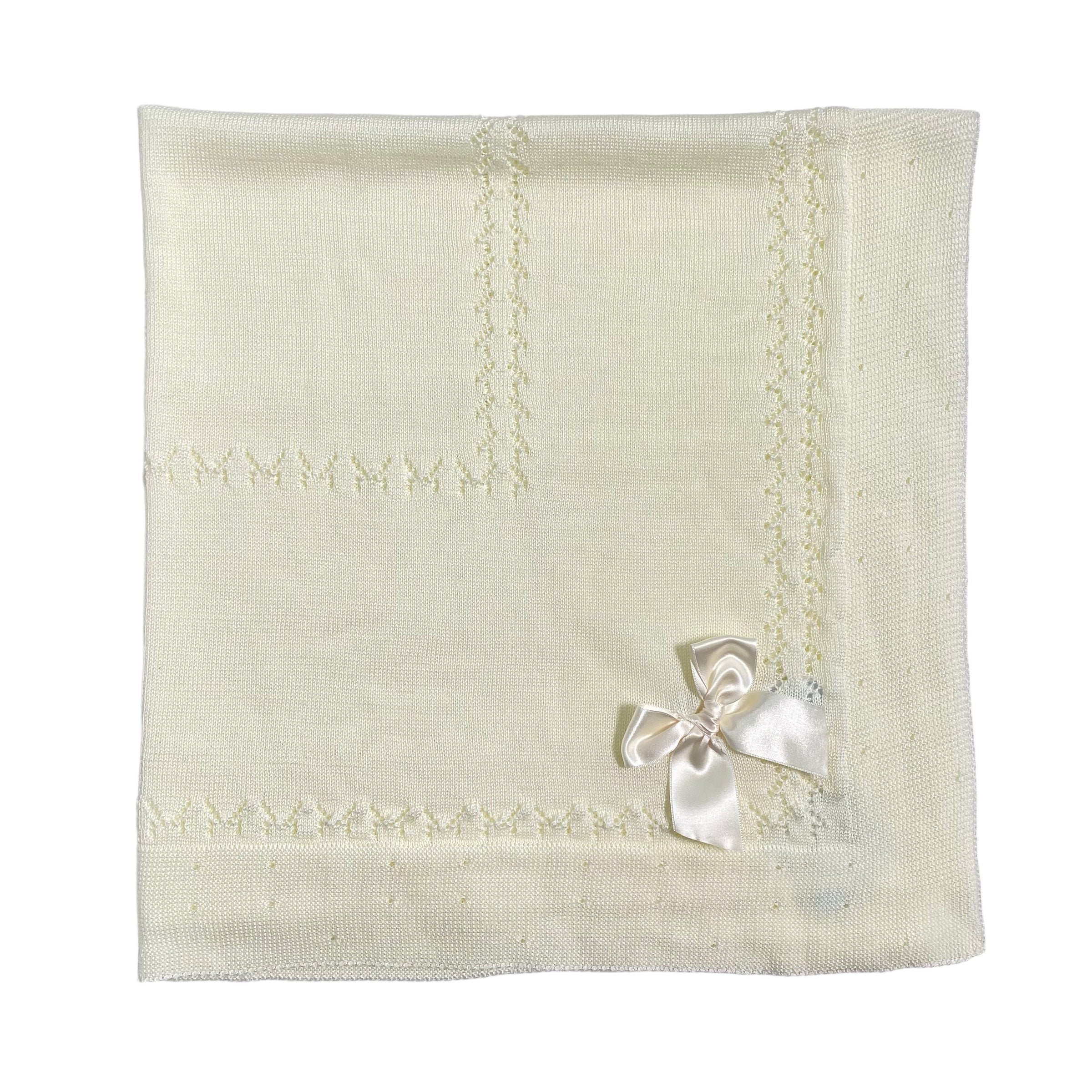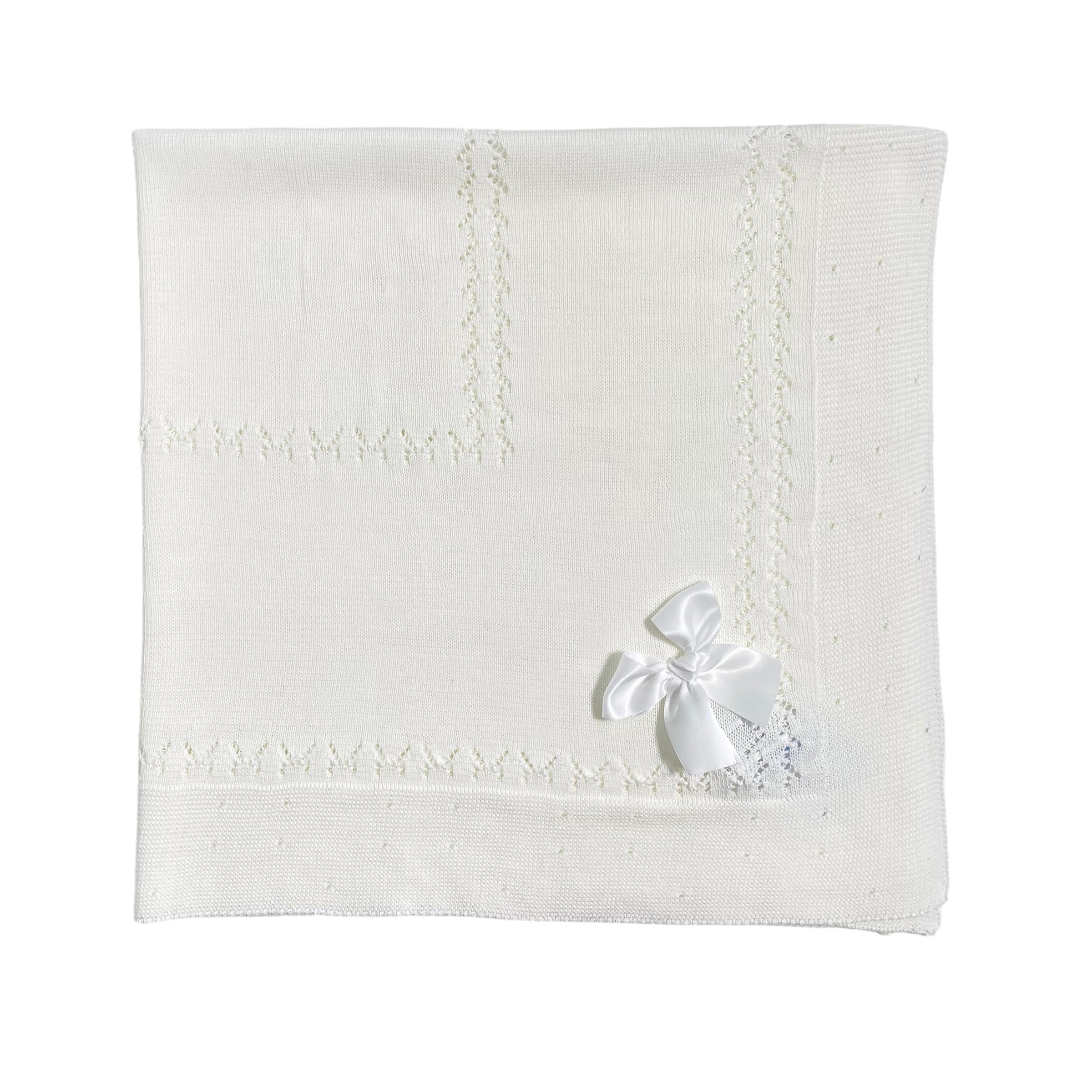 Proteggi il tuo neonato con stile, con la nostra coperta elegante in tessuto anallergico acrilico. Perfetta per tenere il tuo piccolo/a caldo/a e confortevole, grazie alla sua lavorazione traforata e al fiocco in raso che lo rende ancora più elegante.