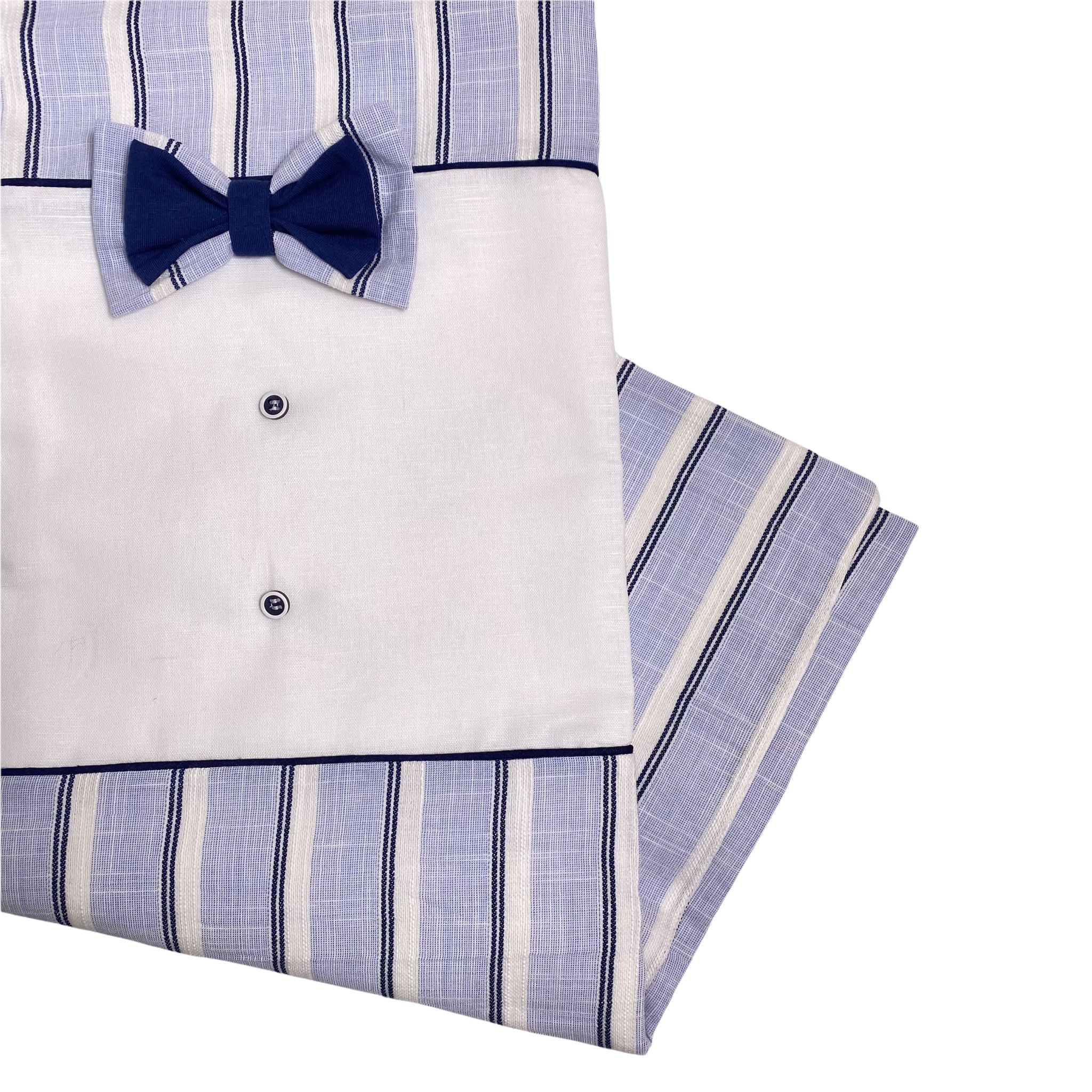 Blanket in white linen blend, with white, light blue and blue striped edges.