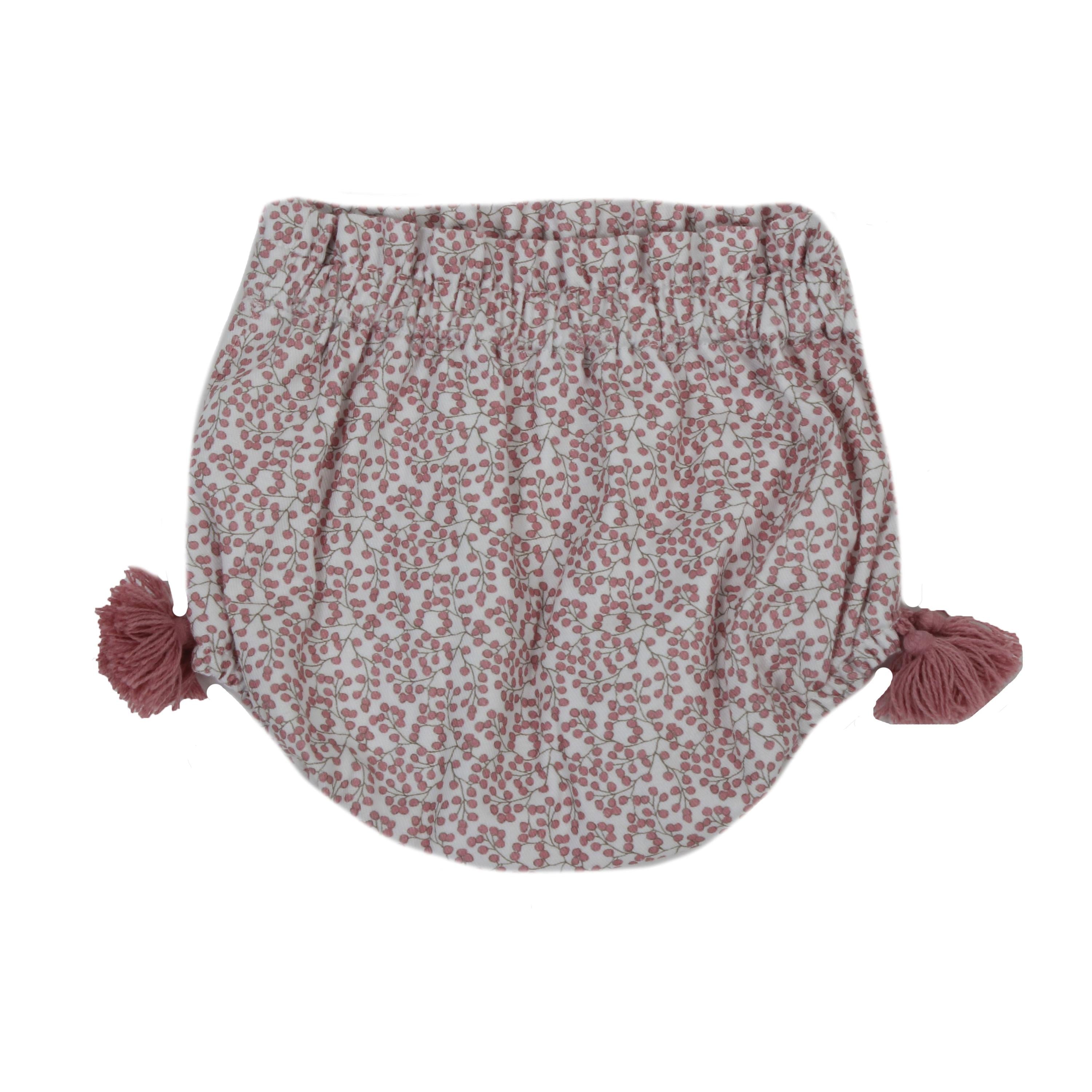 Culotte with elastic waist and legs, floral pattern and tassels on the sides.