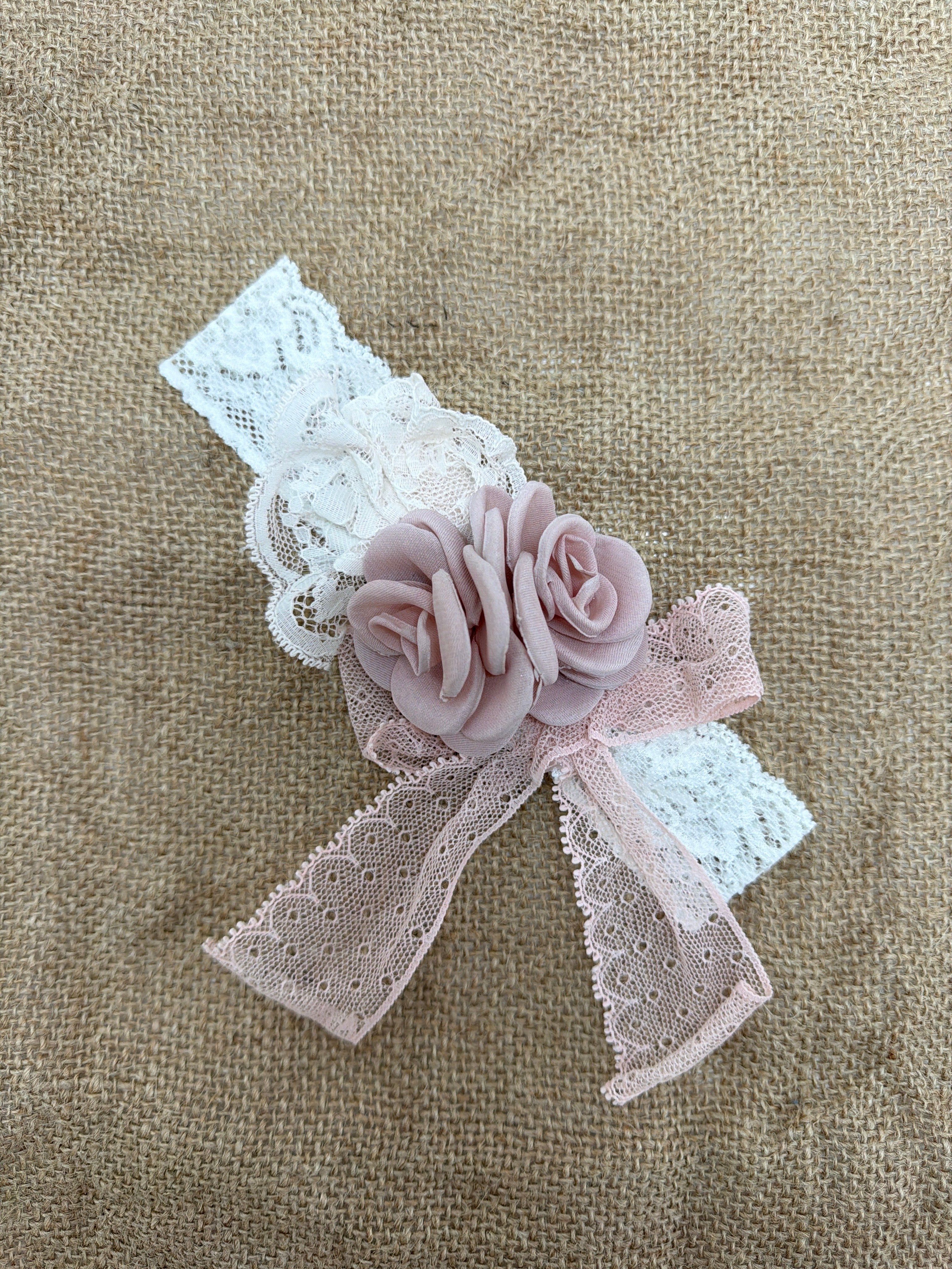 Splendida fascia in pizzo con delicati fiori, perfetta per completare un outfit elegante per una cerimonia o un'occasione speciale. Aggiungi un tocco di bellezza alla tua neonata con MIMILU'.