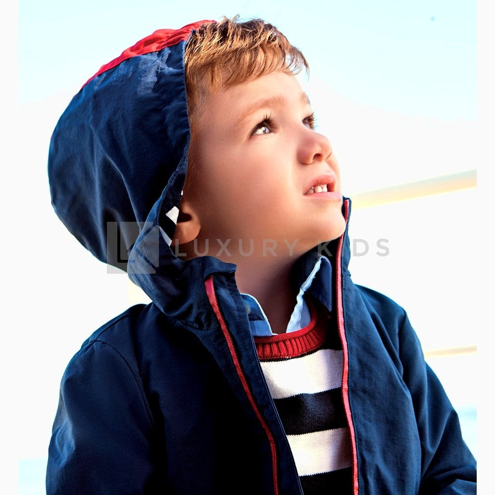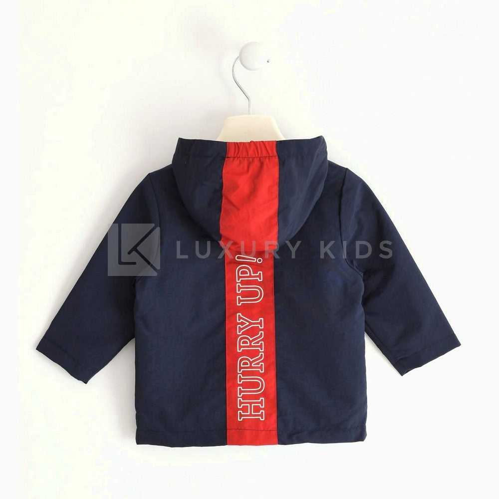 Technical nylon jacket with contrasting red zip both on the front and in the pockets. The back of the garment is characterized by a red band with writing that runs from the hood to the bottom of the garment