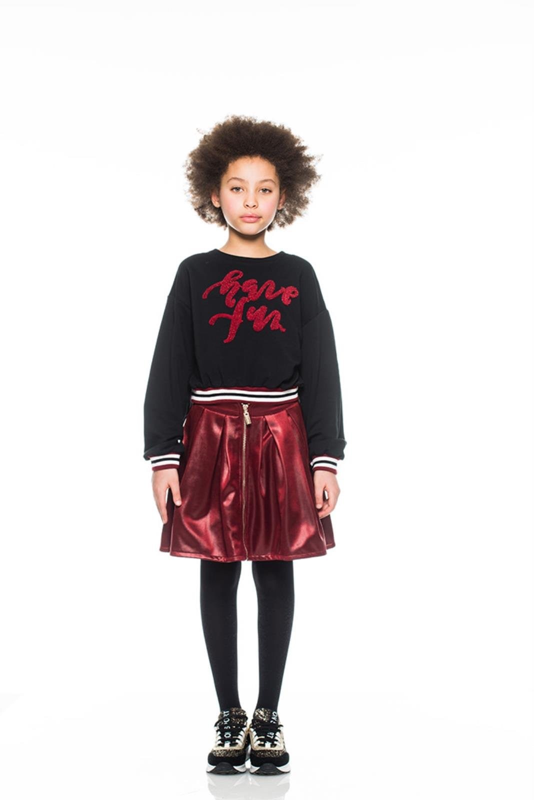 Asymmetrical skirt (short forward and long back) in shiny fabric with front zip closure