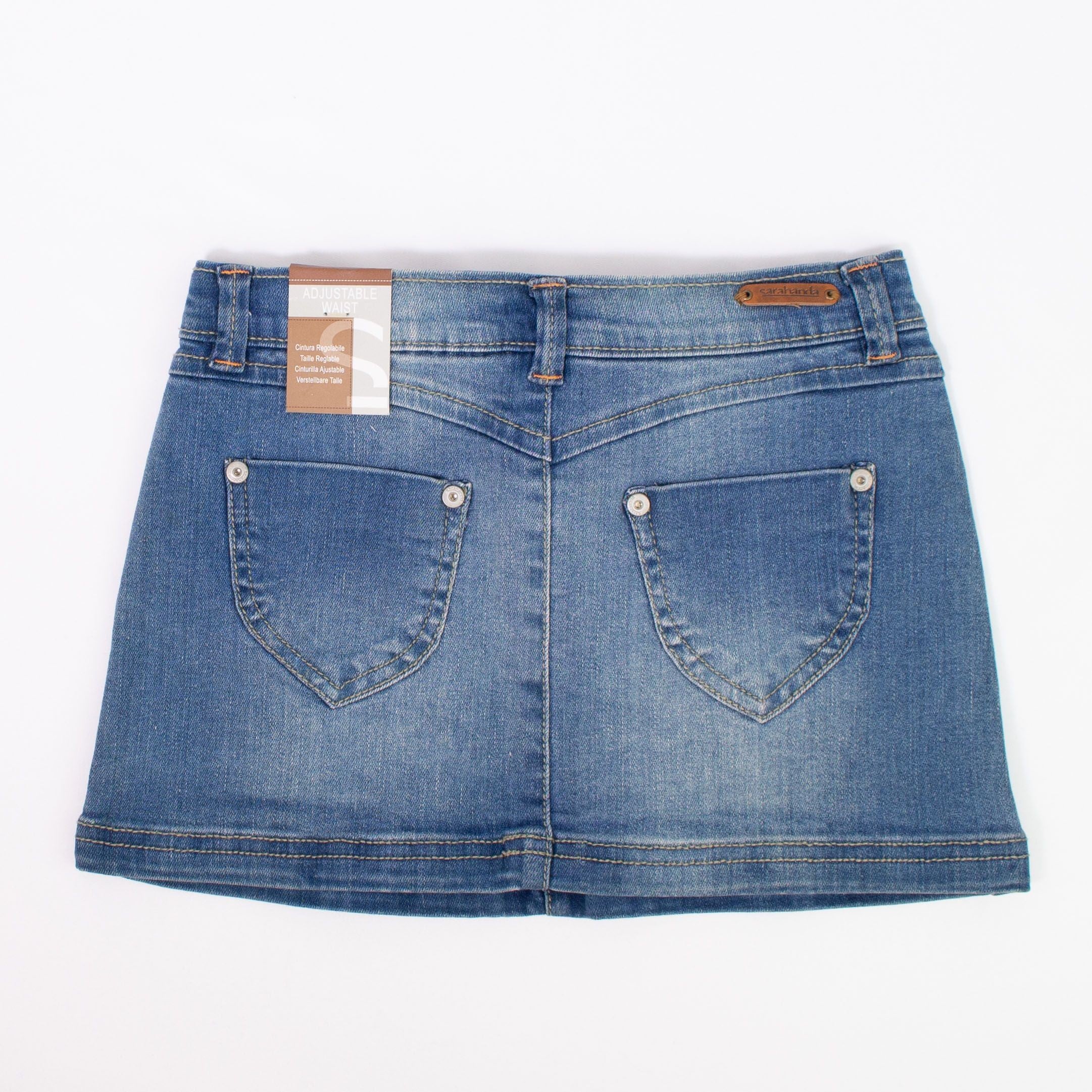 Cotton denim skirt with butterfly-shaped rhinestones applied on the front and button and zip closure on the front