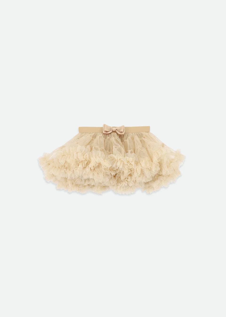 Iconico tutù Angel's Face per neonati, color sabbia con glitter oro. La gonna è raccolta in una morbida fascia elastica in vita, completamente foderata in un confortevole misto cotone. Strati di morbido tulle e volant creano volume e movimento, completati dal nostro caratteristico fiocco in vita.
