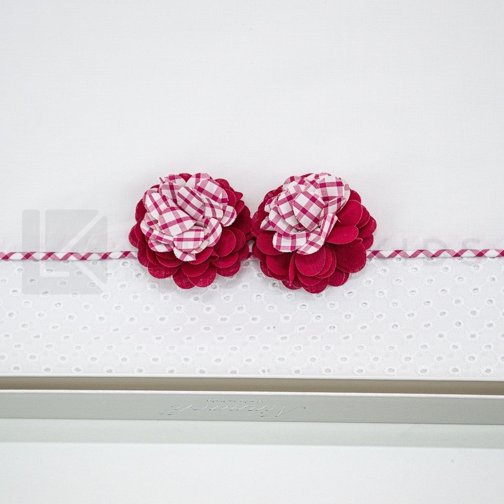 -100% cotton with San Gallo lace border and removable red flower applications on the flounce