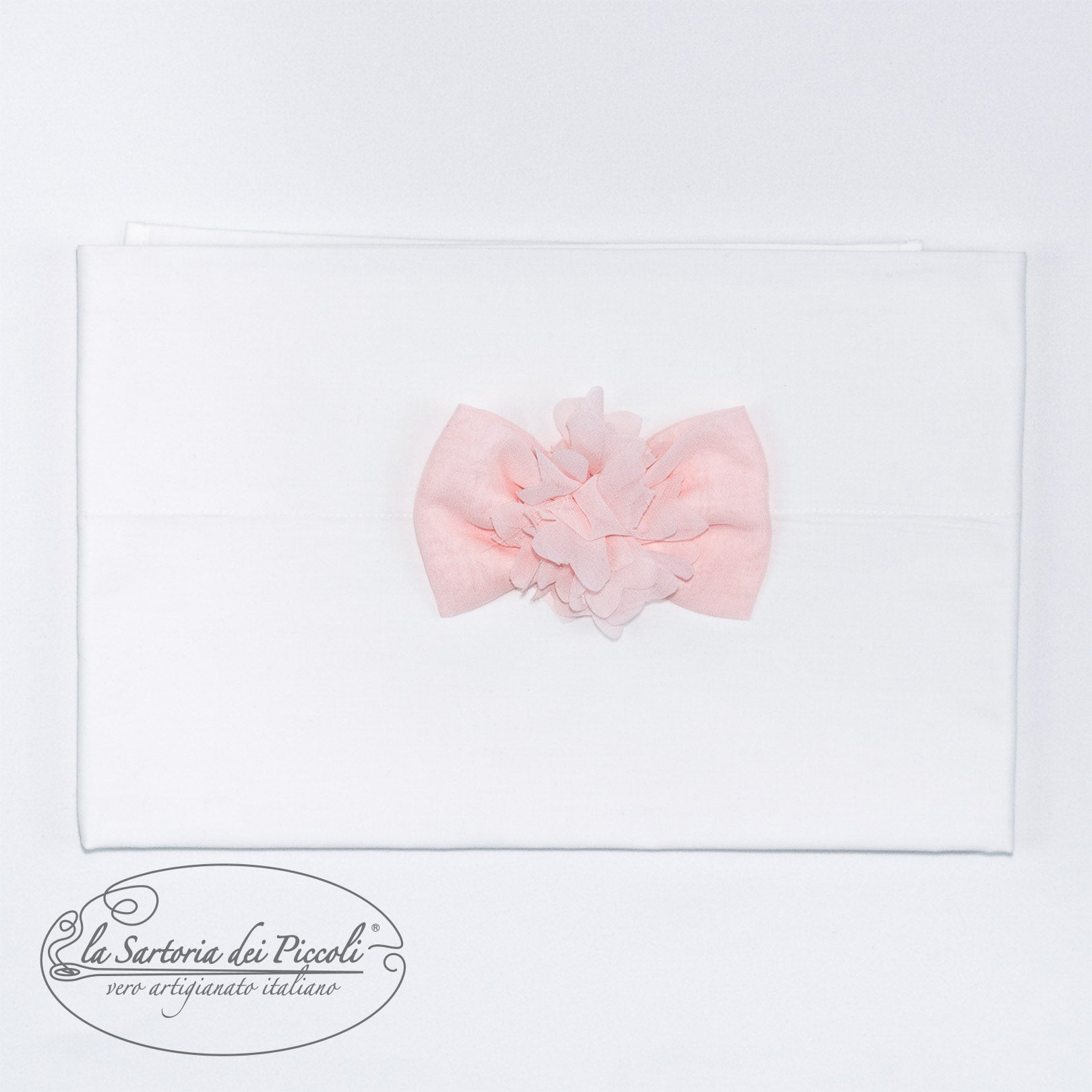 Lenzuolino in cotone puro con fiocco e fiori applicati, perfetto per culla o carrozzina. Garanzia di raffinatezza ed eleganza per i primi sogni del tuo bebè. Tessuto morbido e delicato sulla pelle del tuo piccolo tesoro.