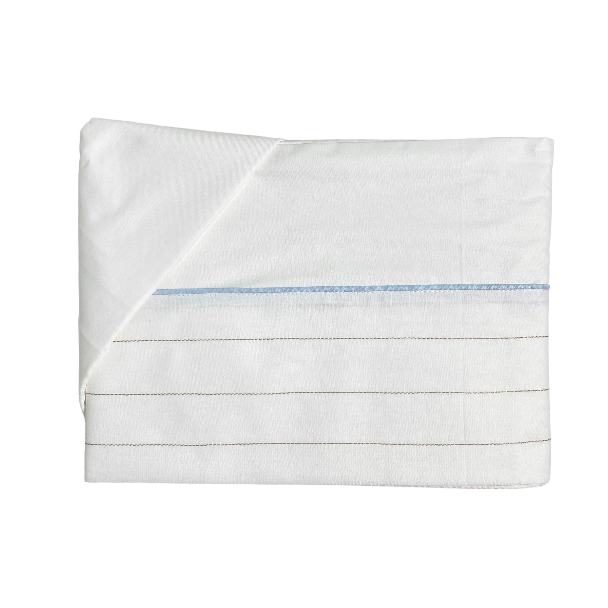 Lenzuolino per carrozzina in cotone, in tinta unita bianco, con profilo celeste e cuciture beige.
