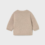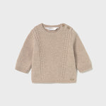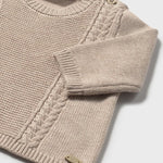 Contiene poliammide riciclato. Maglioncino manica lunga per neonato. Girocollo. Chiusura con bottoni sulla spalla per facilitare la vestibilità. Elementi decorativi intrecciati.