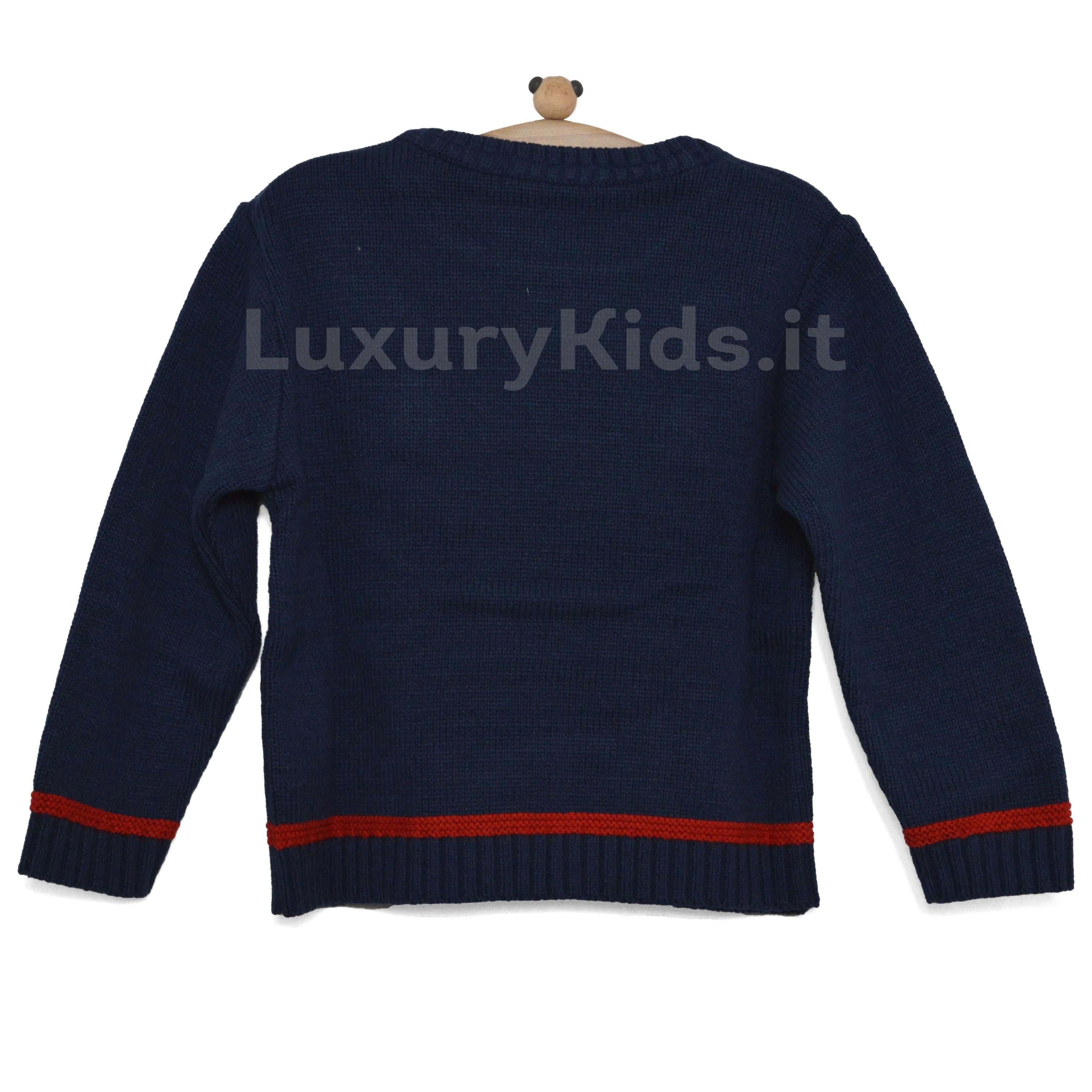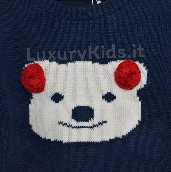 -Solid color blue wool blend teddy bear sweater with pom-poms applied on the front
