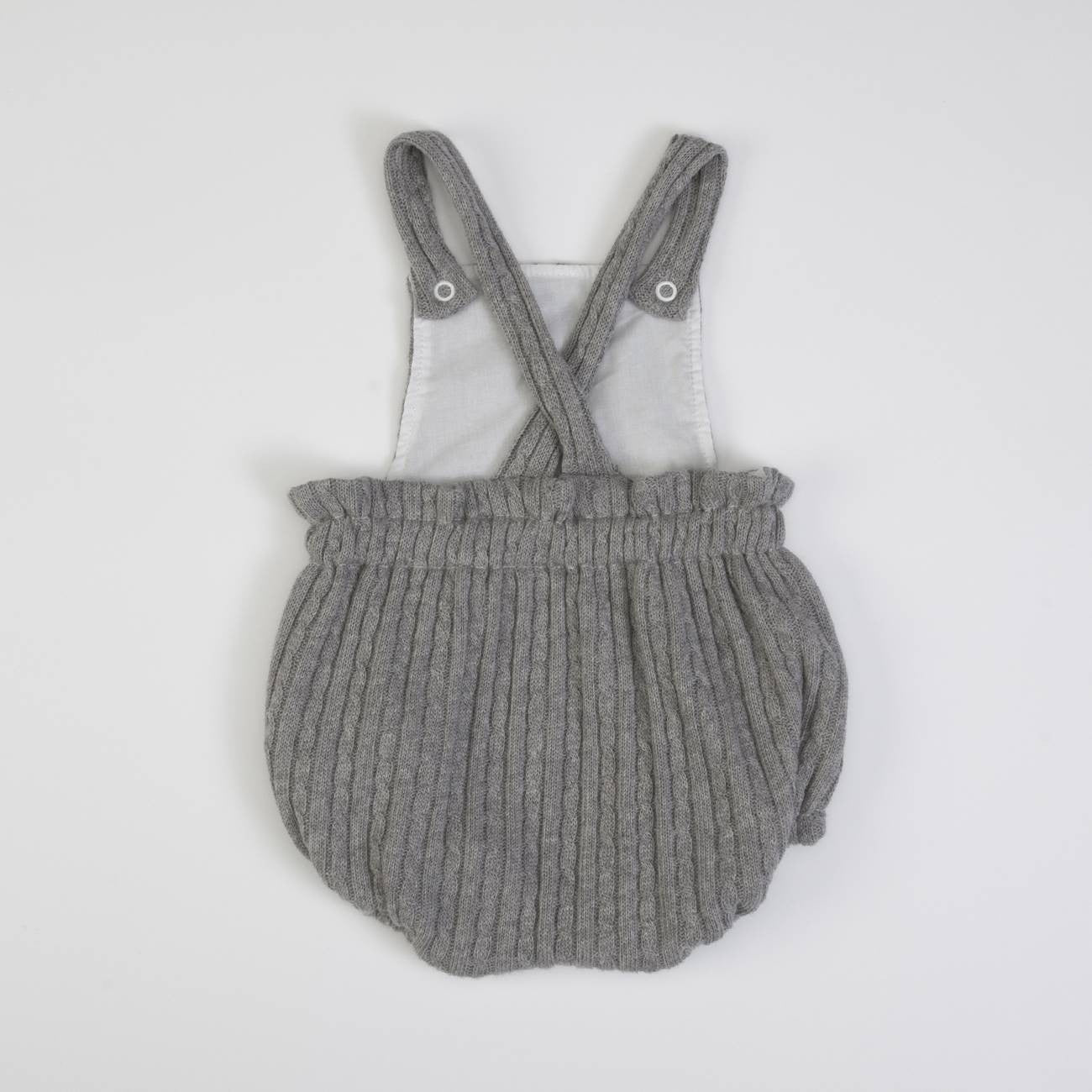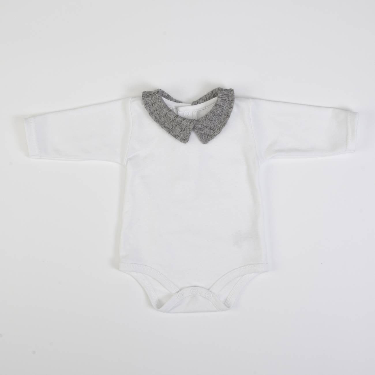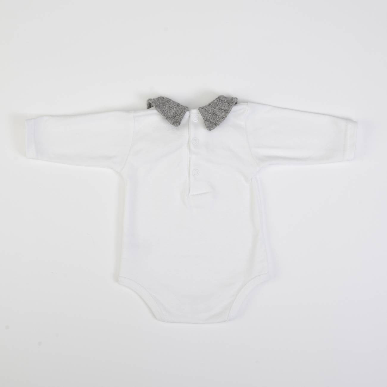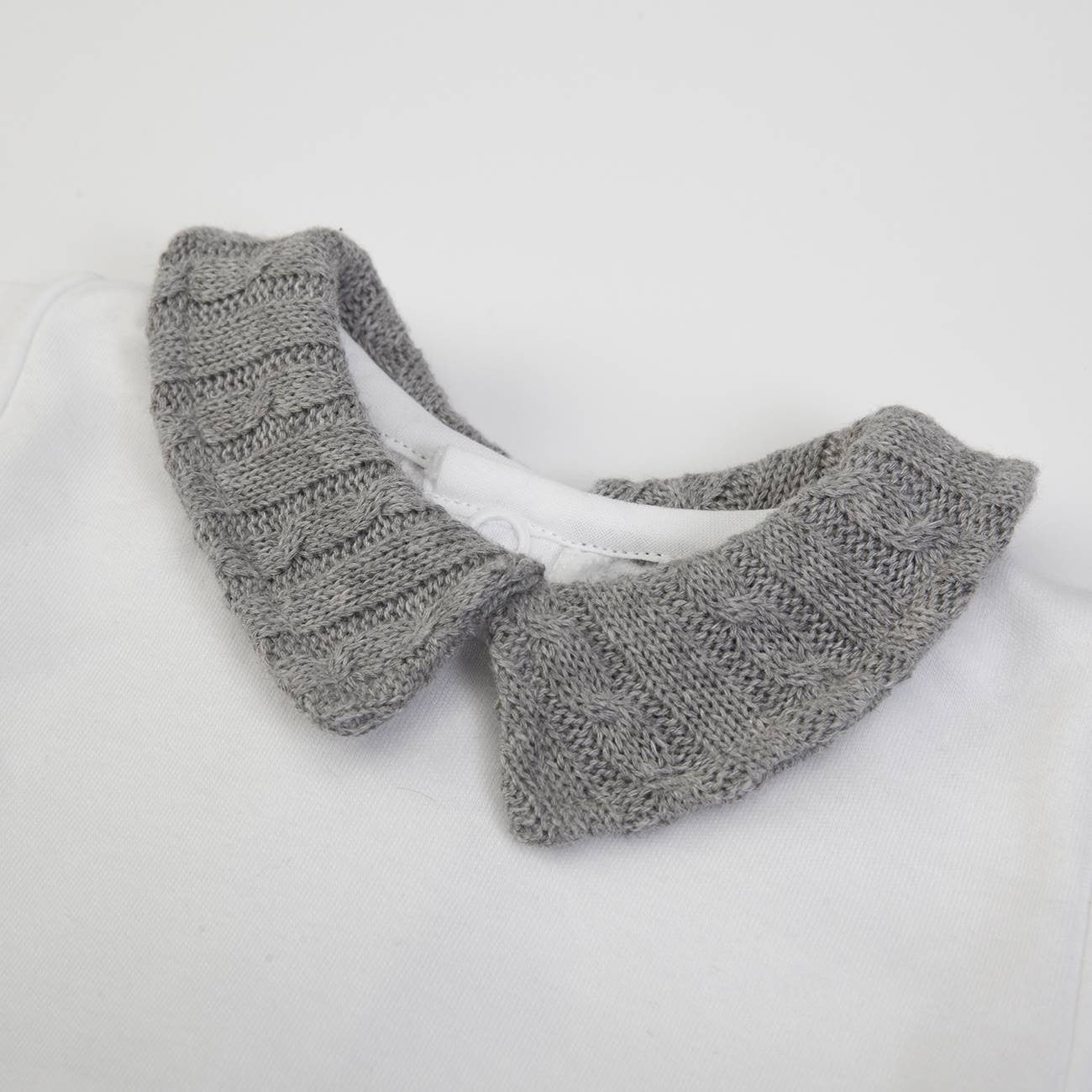 Wool romper with elastic waist and legs and white body with wool collar, long sleeves and buttons on the back.
