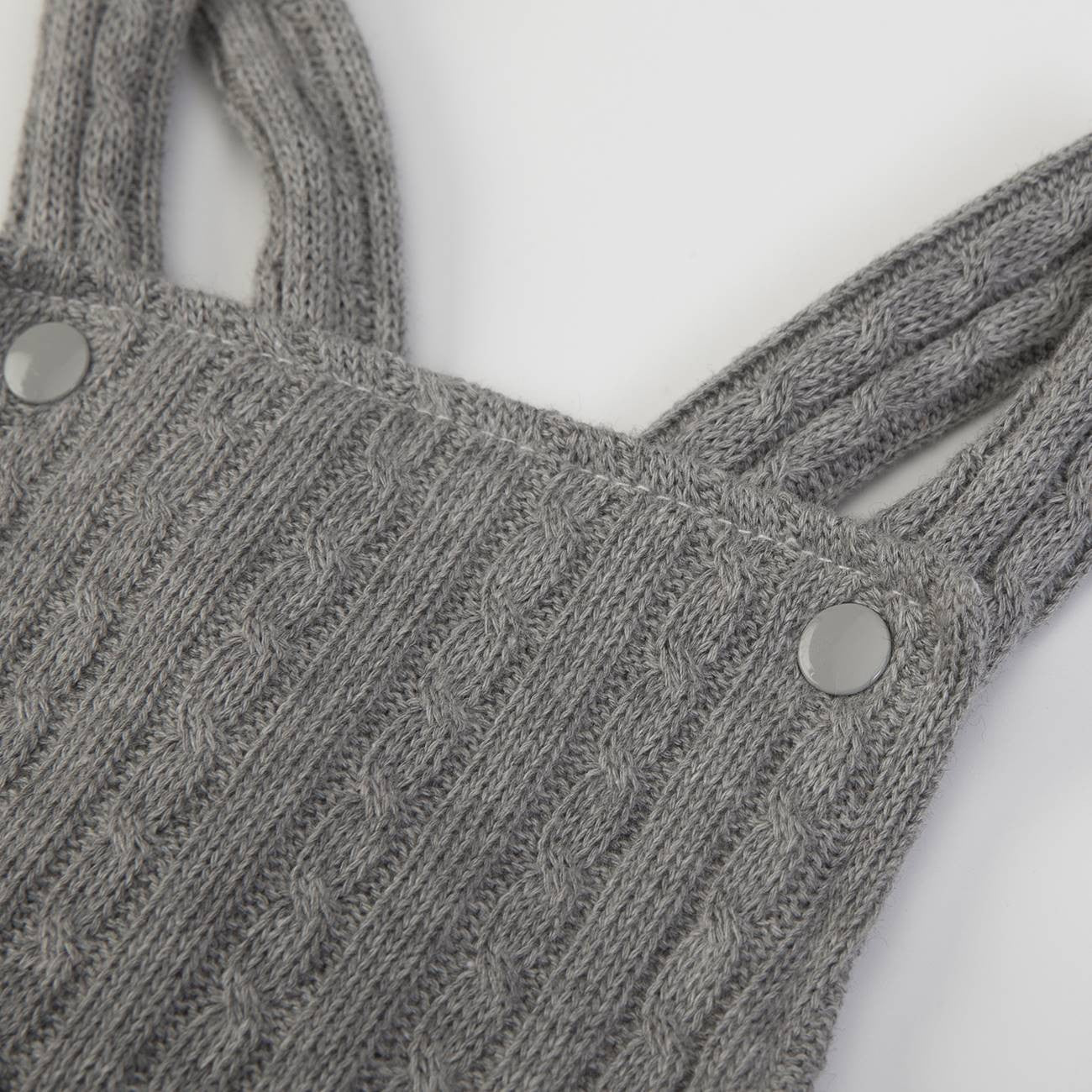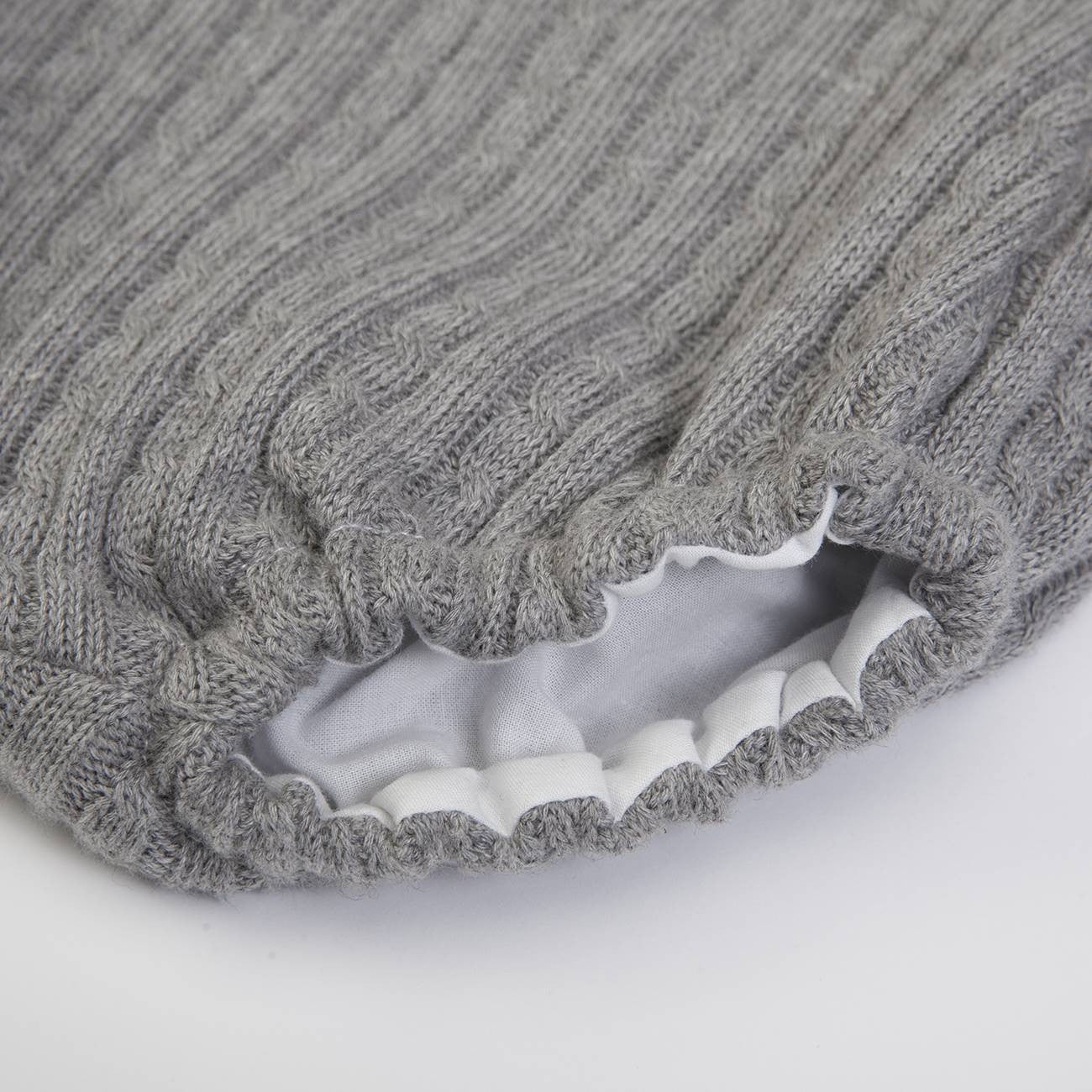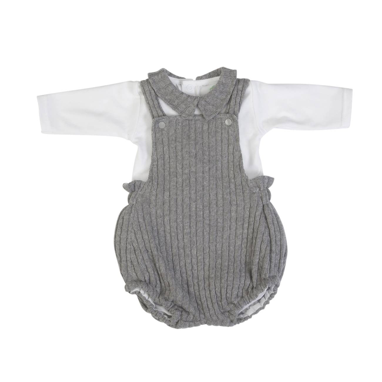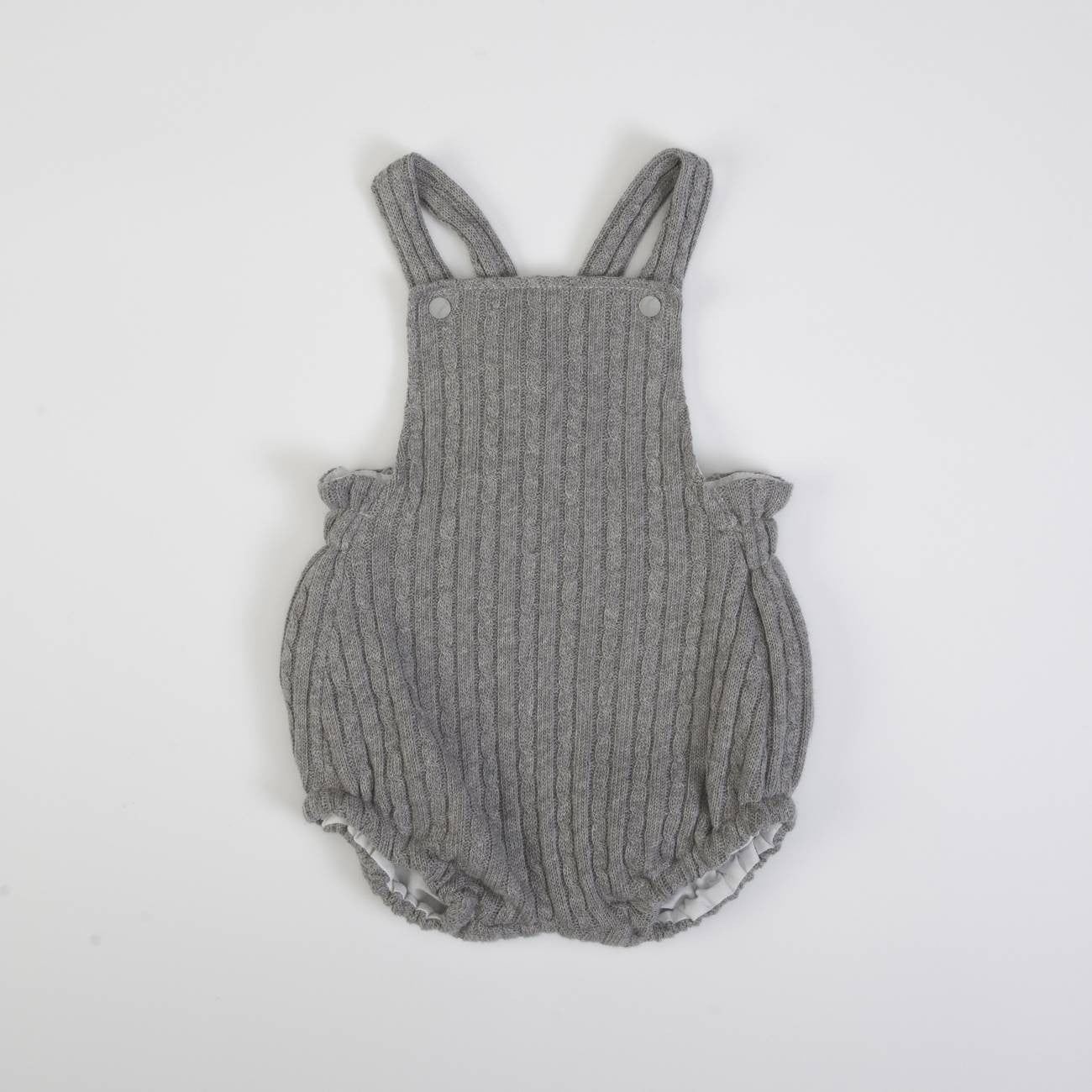 Wool romper with elastic waist and legs and white body with wool collar, long sleeves and buttons on the back.