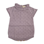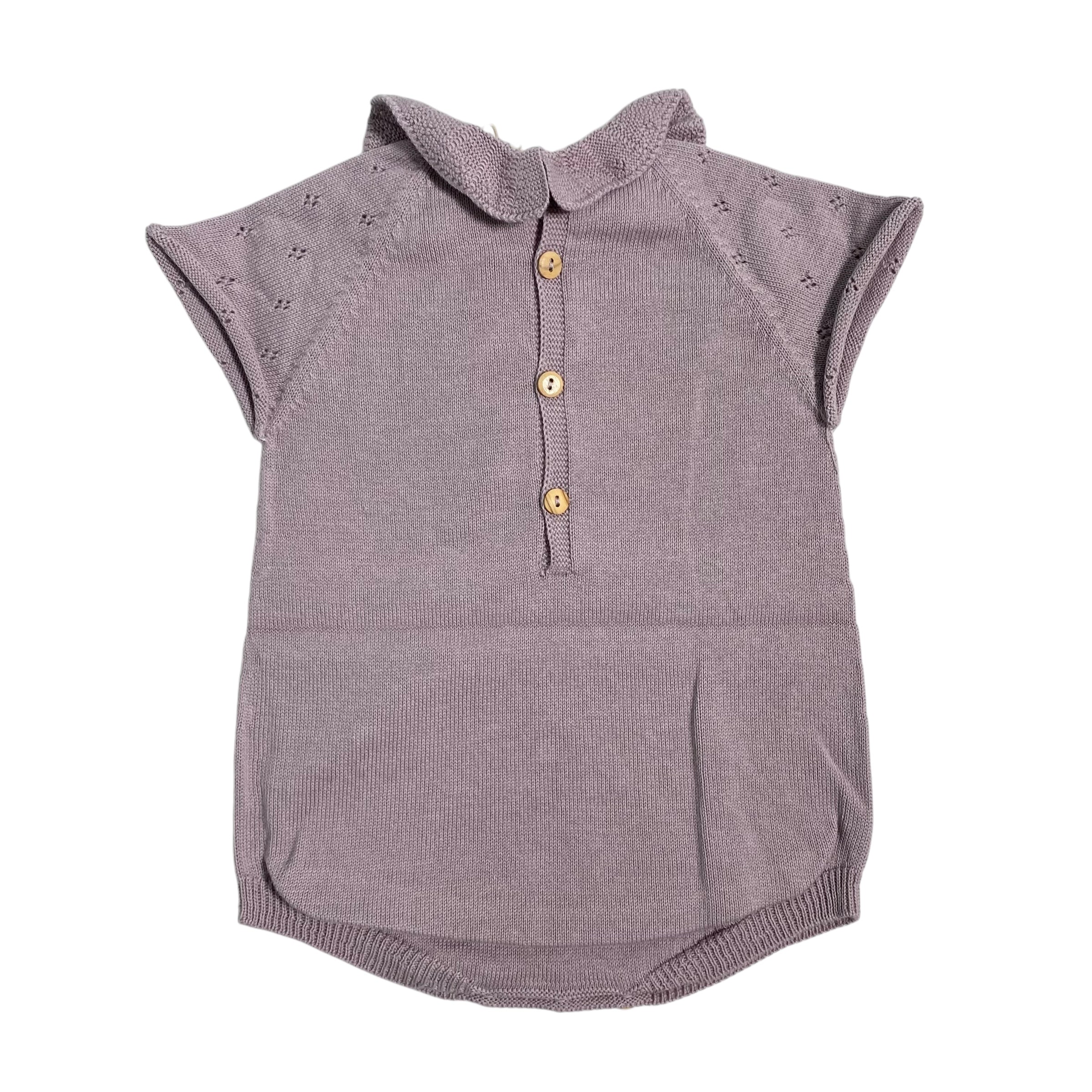 Pagliaccetto lavorato a maglia in maglia fine di cotone biologico morbido e traspirante, ideale per neonati. Pagliaccetto a maniche corte BREEZE con chiusura posteriore e tra le gambe con bottoni in legno. Prodotto in Wholegarment, pezzo unico senza cuciture, per il massimo comfort del tuo bambino.