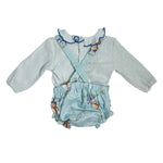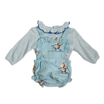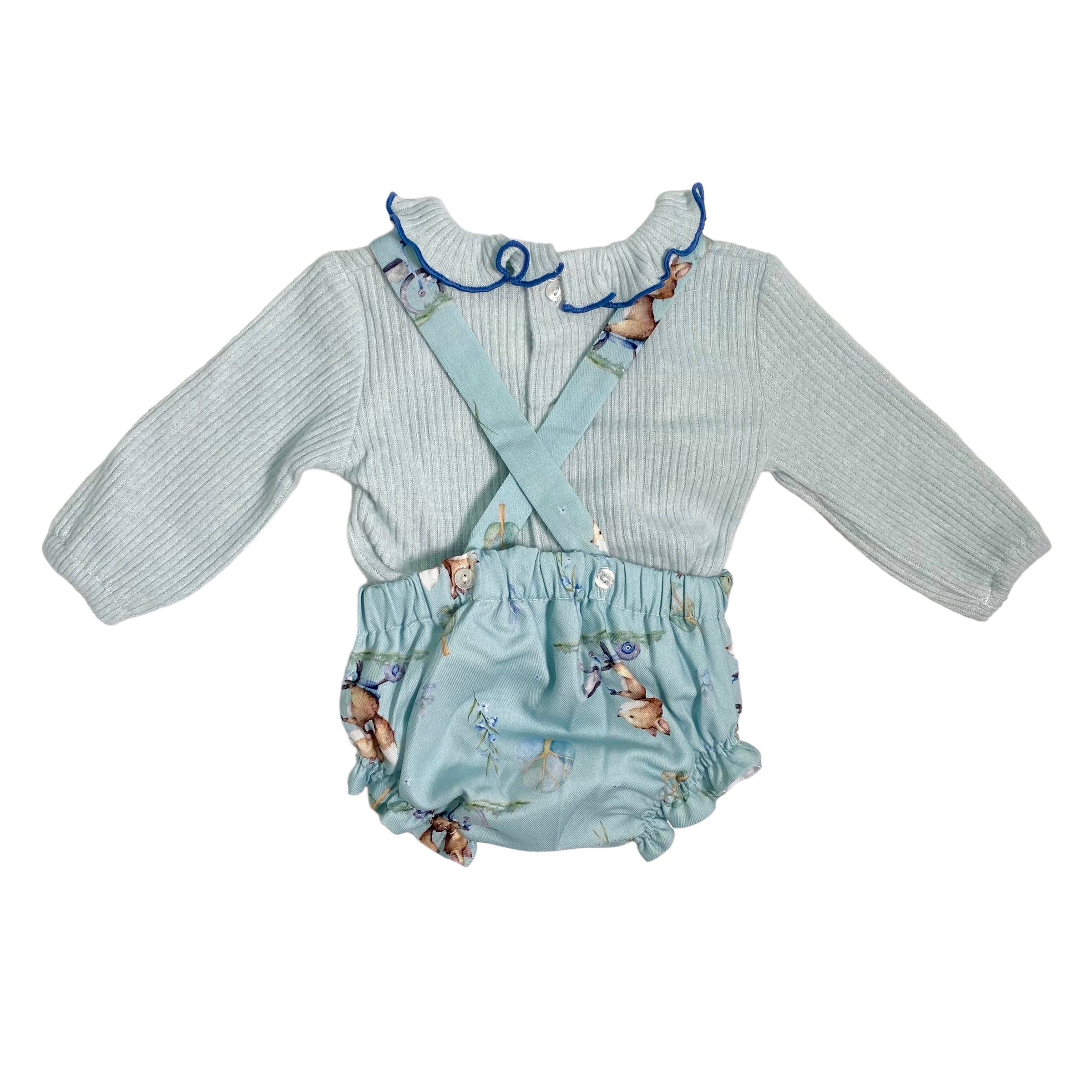 Pagliaccetto in caldo cotone composto da maglietta a coste con collo volant e pagliaccetto fantasia stampata.