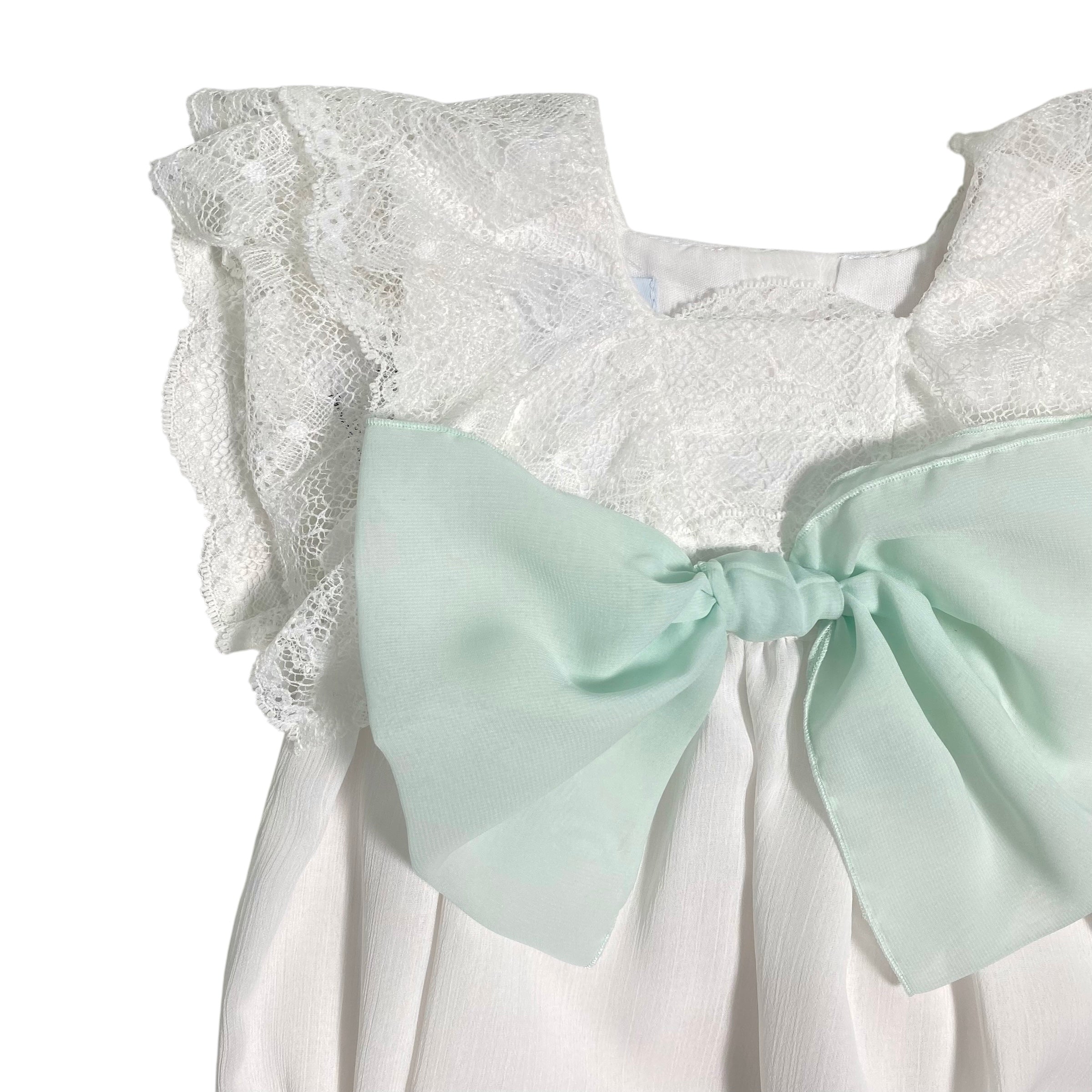 Questo Pagliaccetto Elegante Battesimale GRANLEI è perfetto per le occasioni speciali, come il battesimo di una neonata. Con le sue maniche rouches in pizzo, lo scollo quadrato e il fiocco a contrasto verde sul davanti, è un capo elegante e raffinato. Fatti notare con stile e grazie a questo pagliaccetto unico.