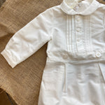 Pagliaccetto elegante manica lunga in shantung di seta, con plissettatura sul davanti e applicazione di bottoncini.