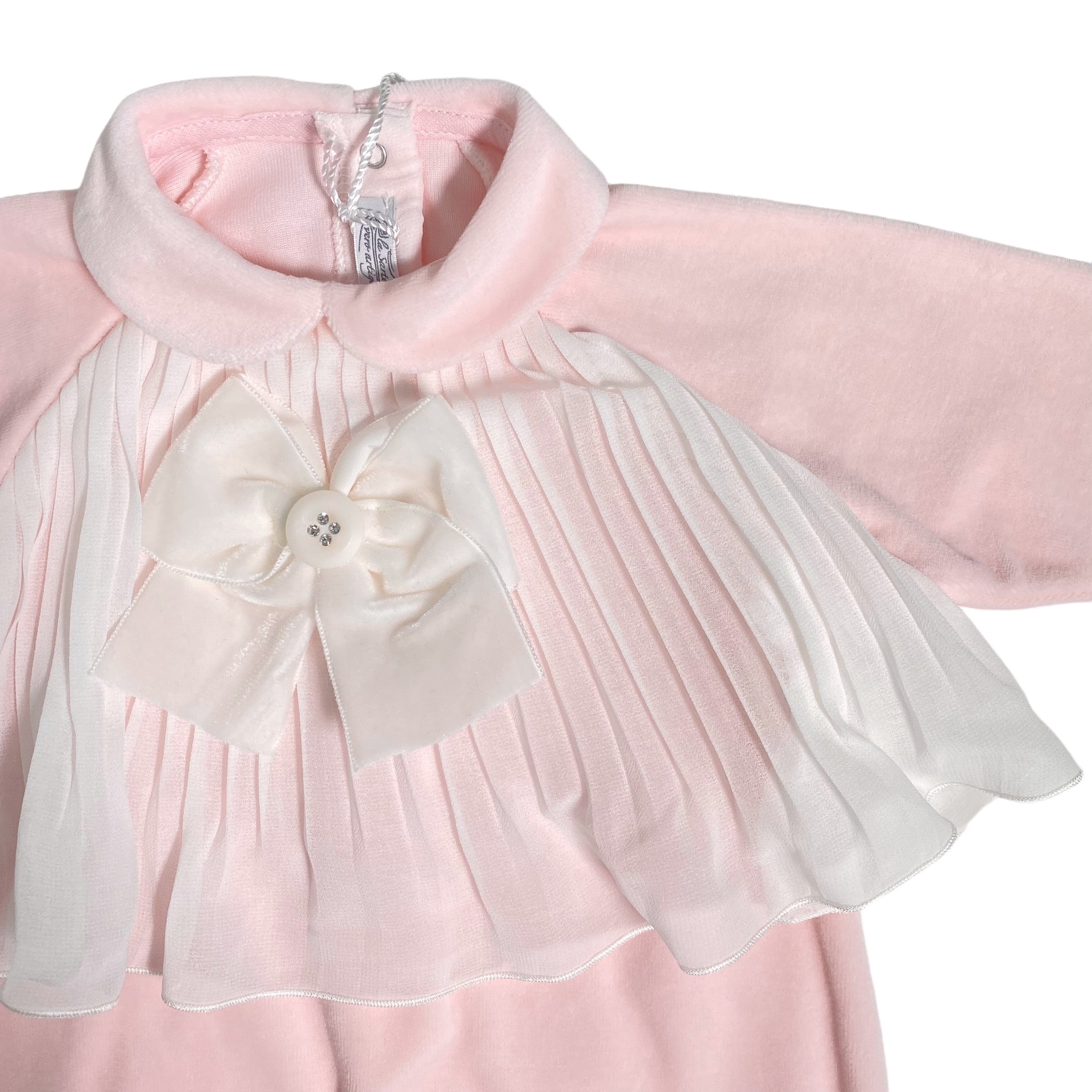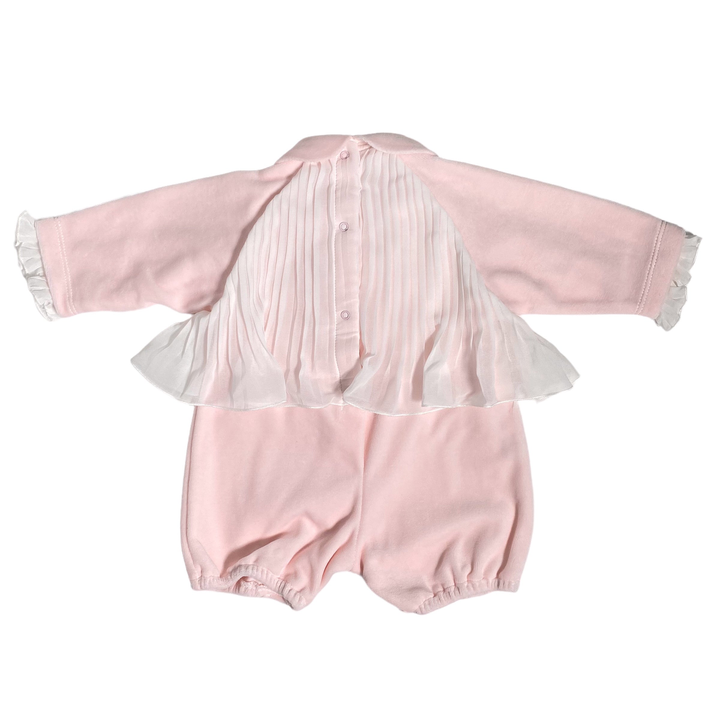 Romper in pink chenille, with pleated organza application on the bodice and pink velvet bow.
