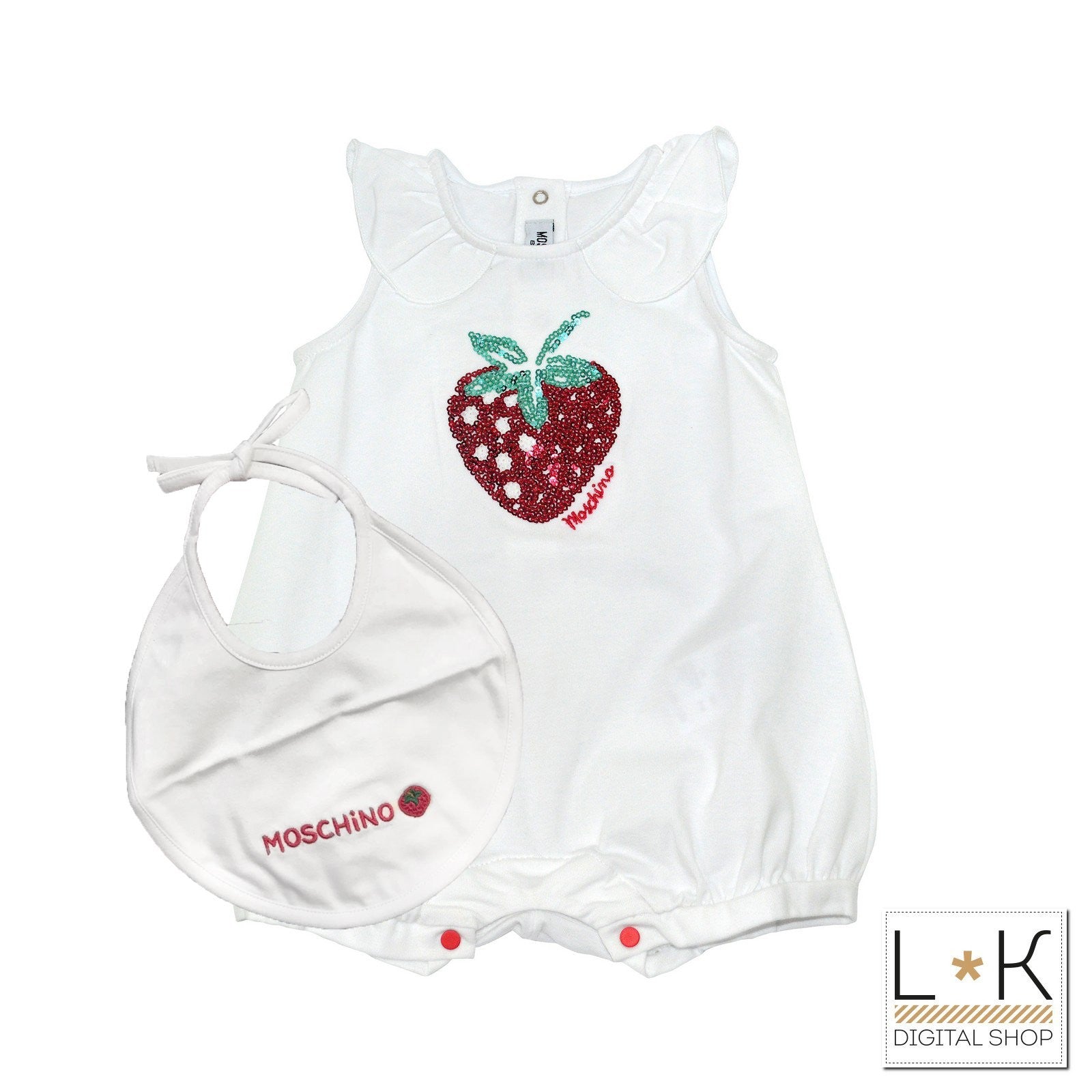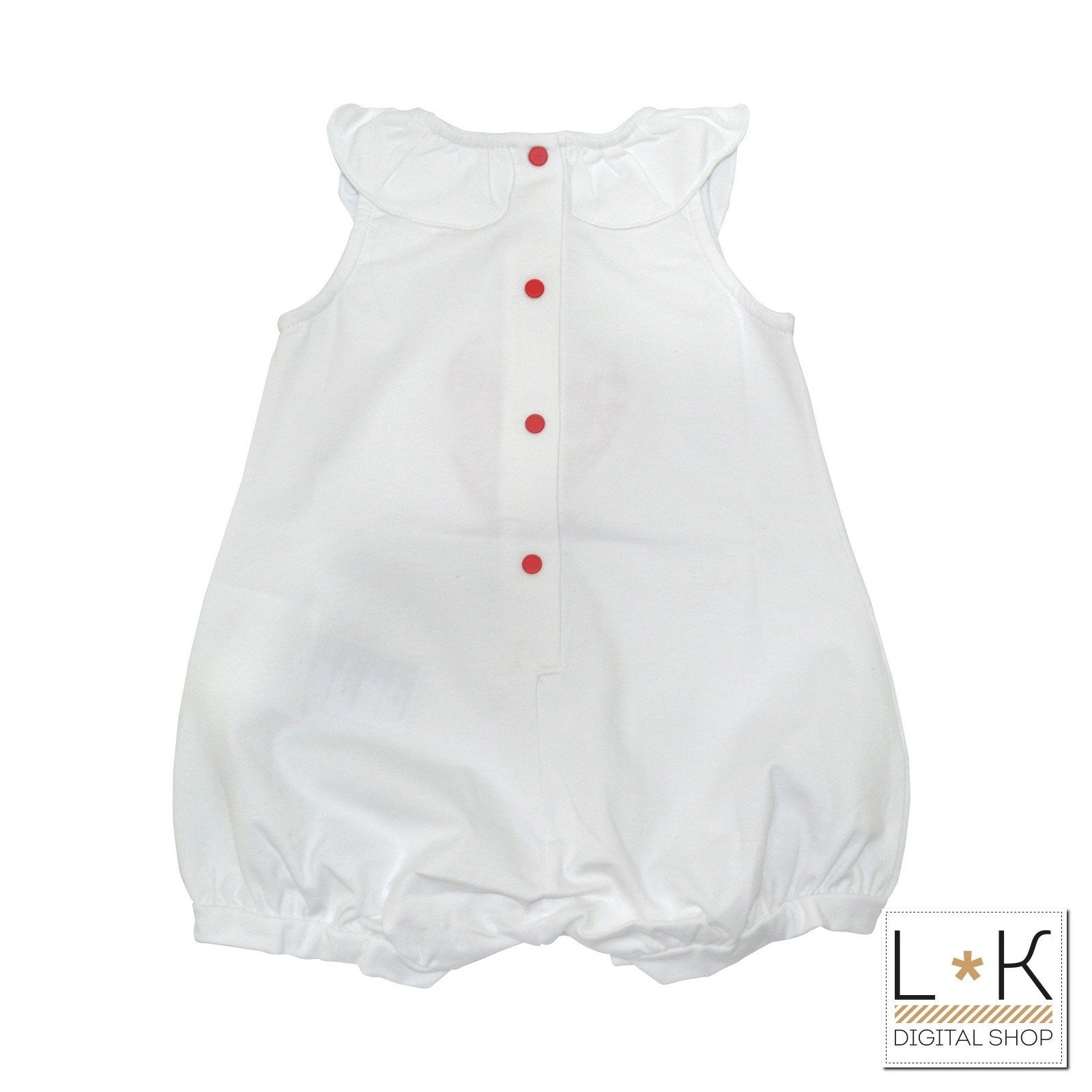 Cotton romper with rouches collar and sequin application on the chest and complete with cotton bib with embroidery.