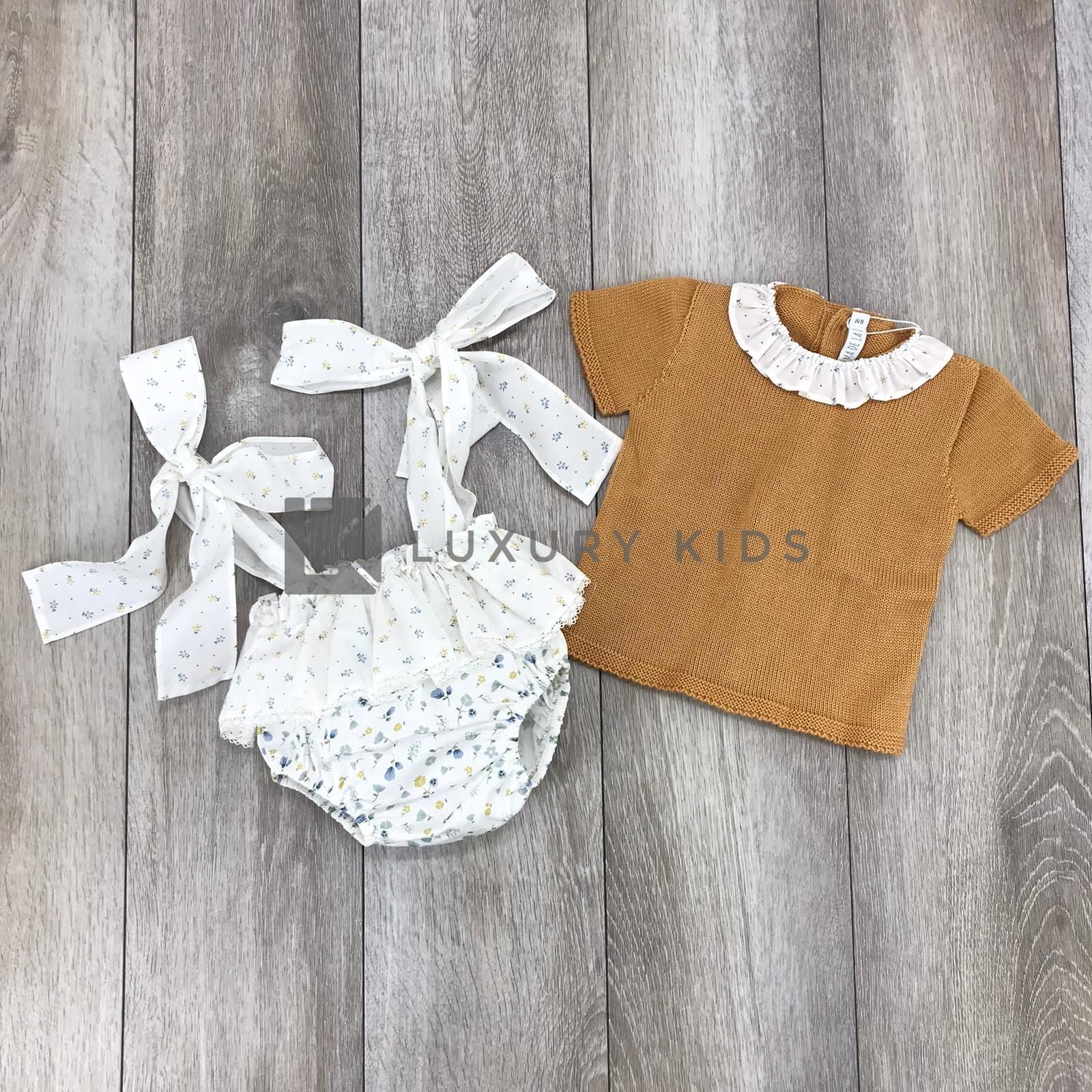 Cotton romper in floral pattern, with bows on the shoulders and half sleeve mustard cotton thread sweater.