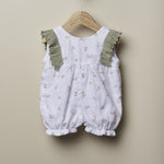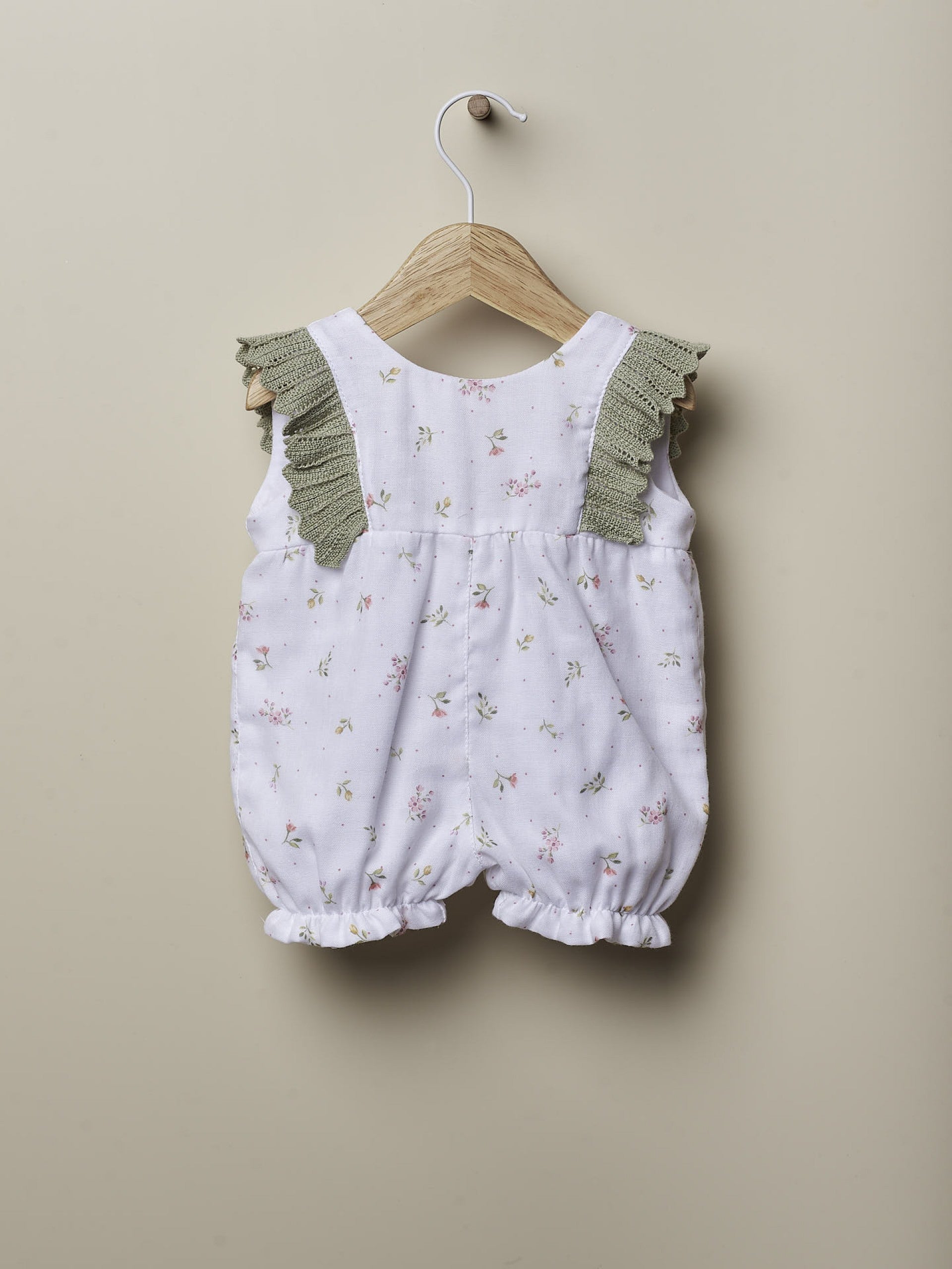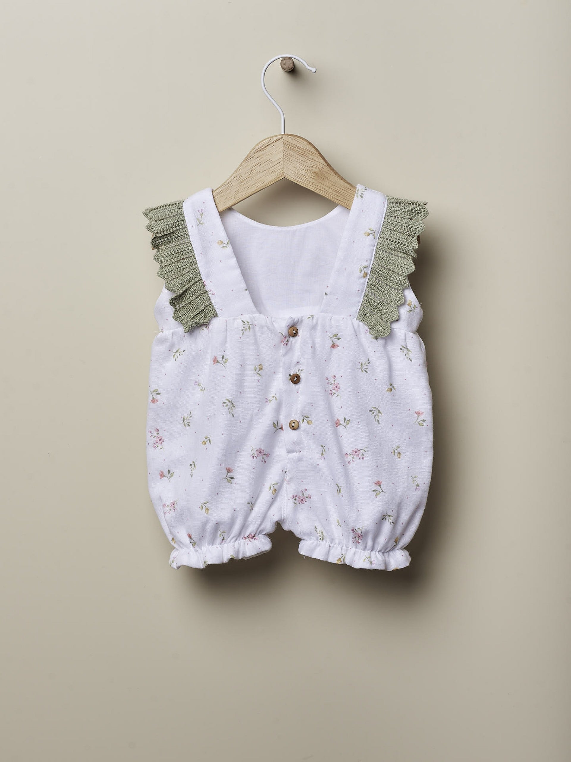 Questo pagliaccetto in cotone bianco con dettagli floreali è perfetto per la tua neonata. Con rouches in filo verde traforato alle maniche e bottoni in legno sul retro, è comodo e adorabile. Lascia che la tua piccola si distingua con stile e comfort grazie a WEDOBLE V2403705A.