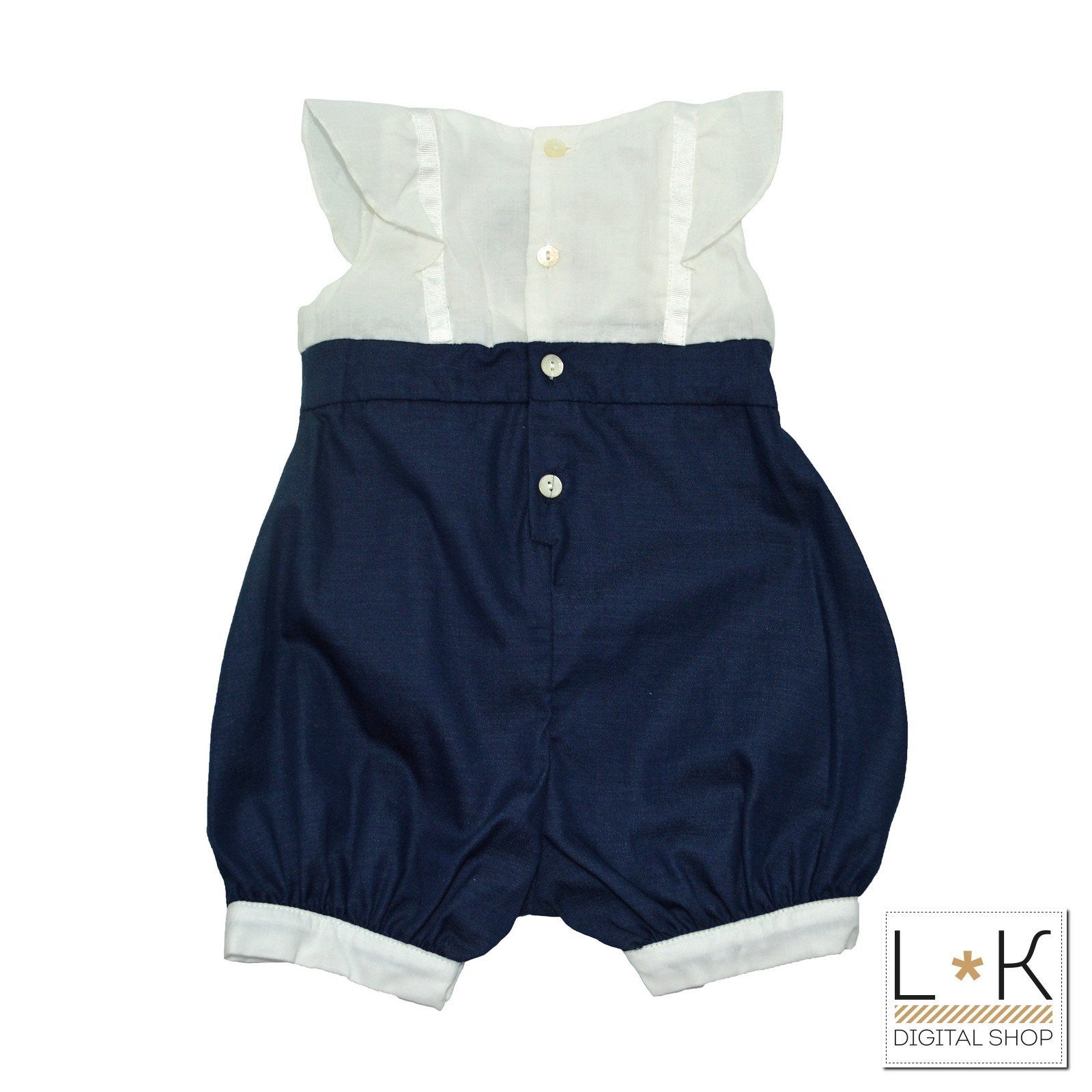 Cotton romper with Baptist bodice with application of two buttons and baciapiega on the front.