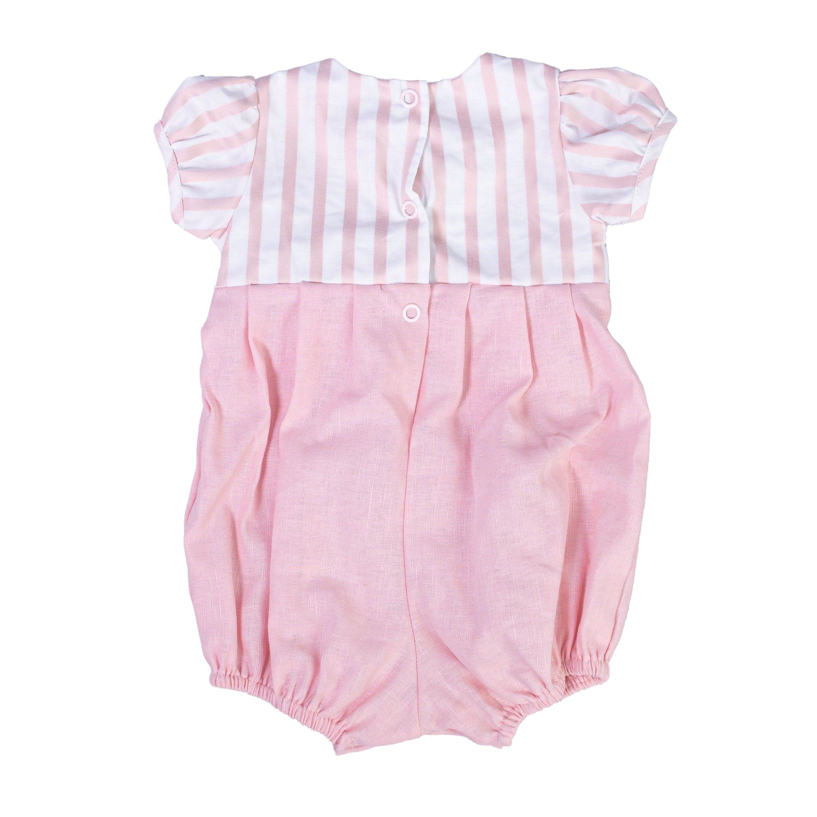 Whole Linen Romper. Top in Cotton, Half Machina with White and Antique Pink Stripes. Waistband In Beige Linen and Flower In Linen and Tulle.