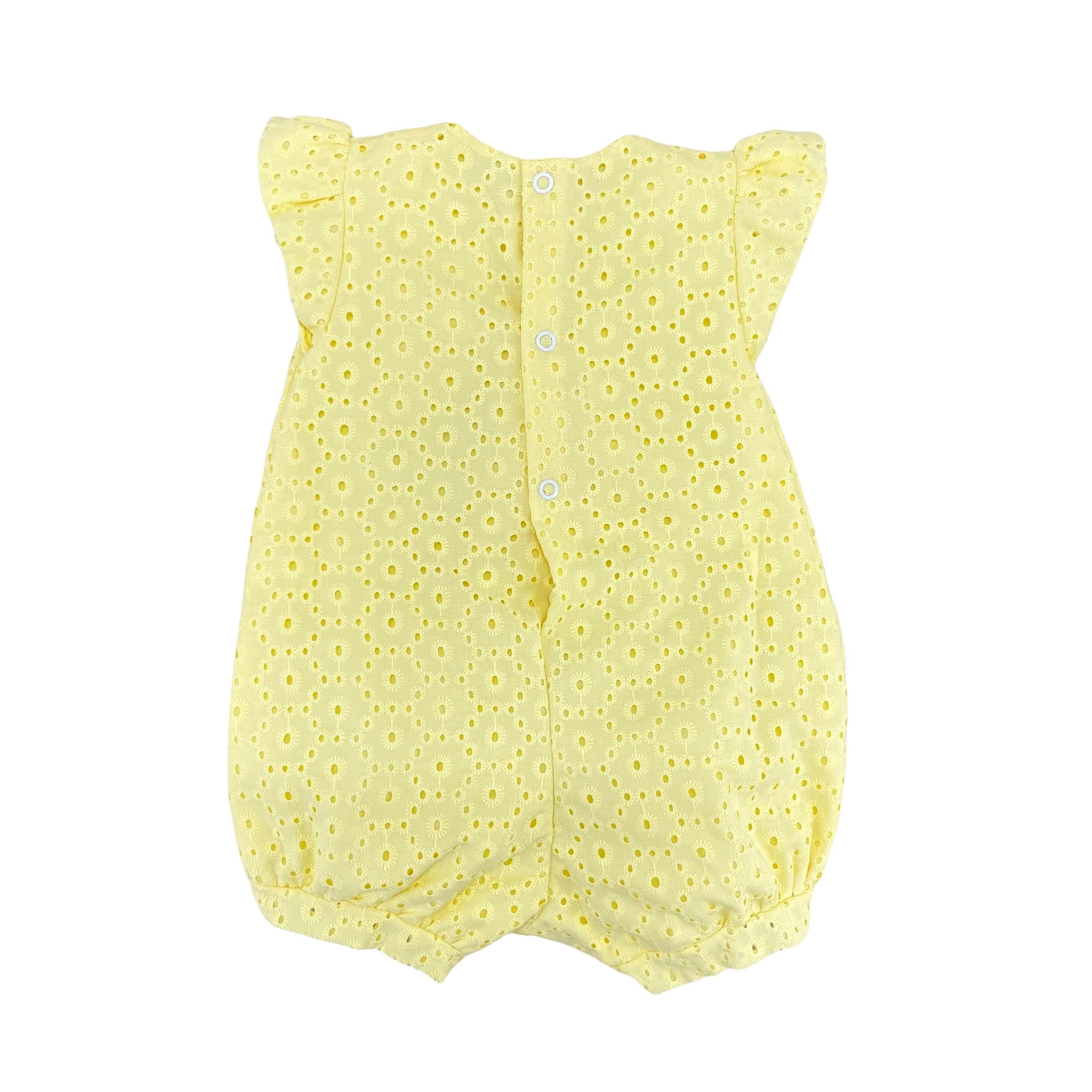 Whole romper in San Gallo lace, in solid yellow color, with bow application on the front.