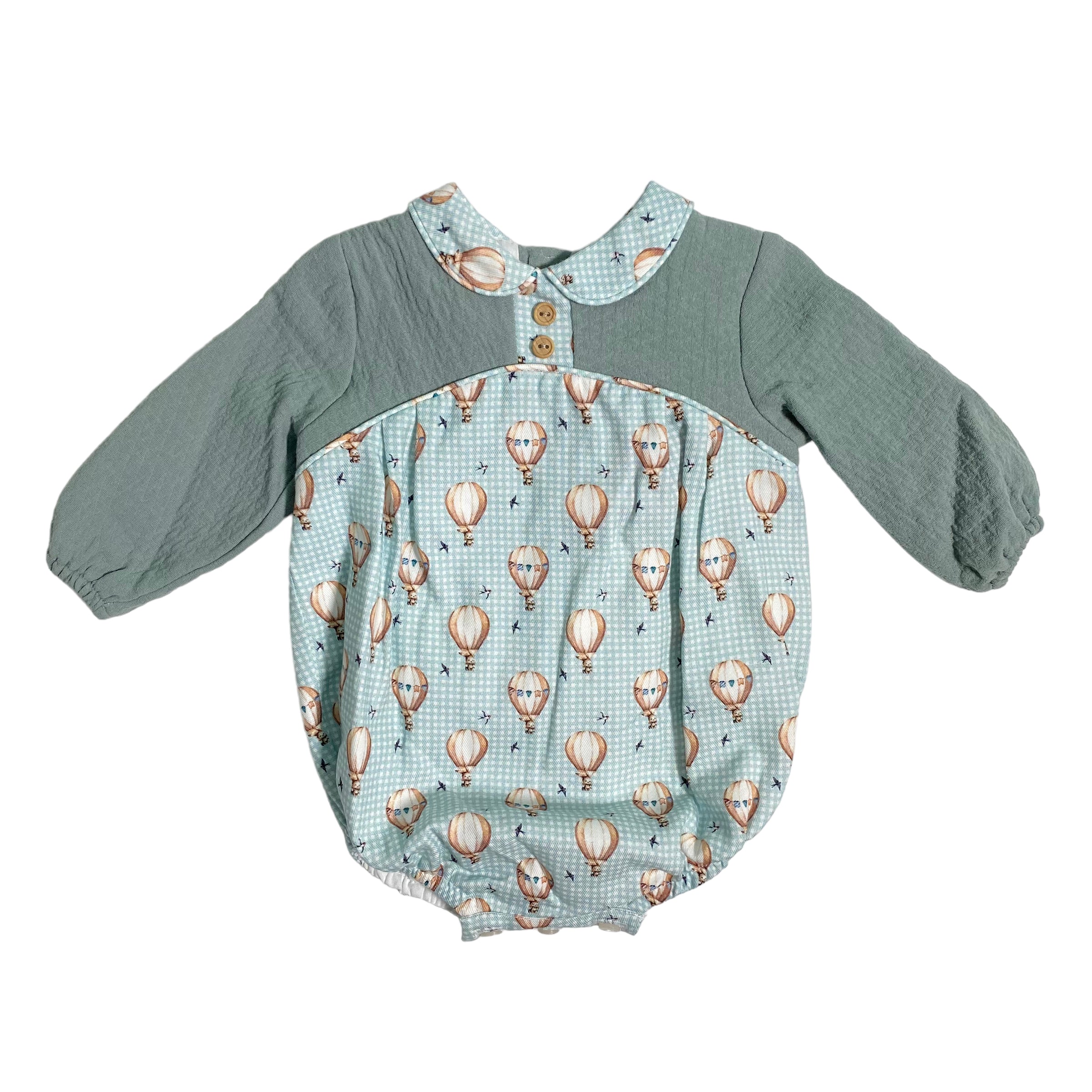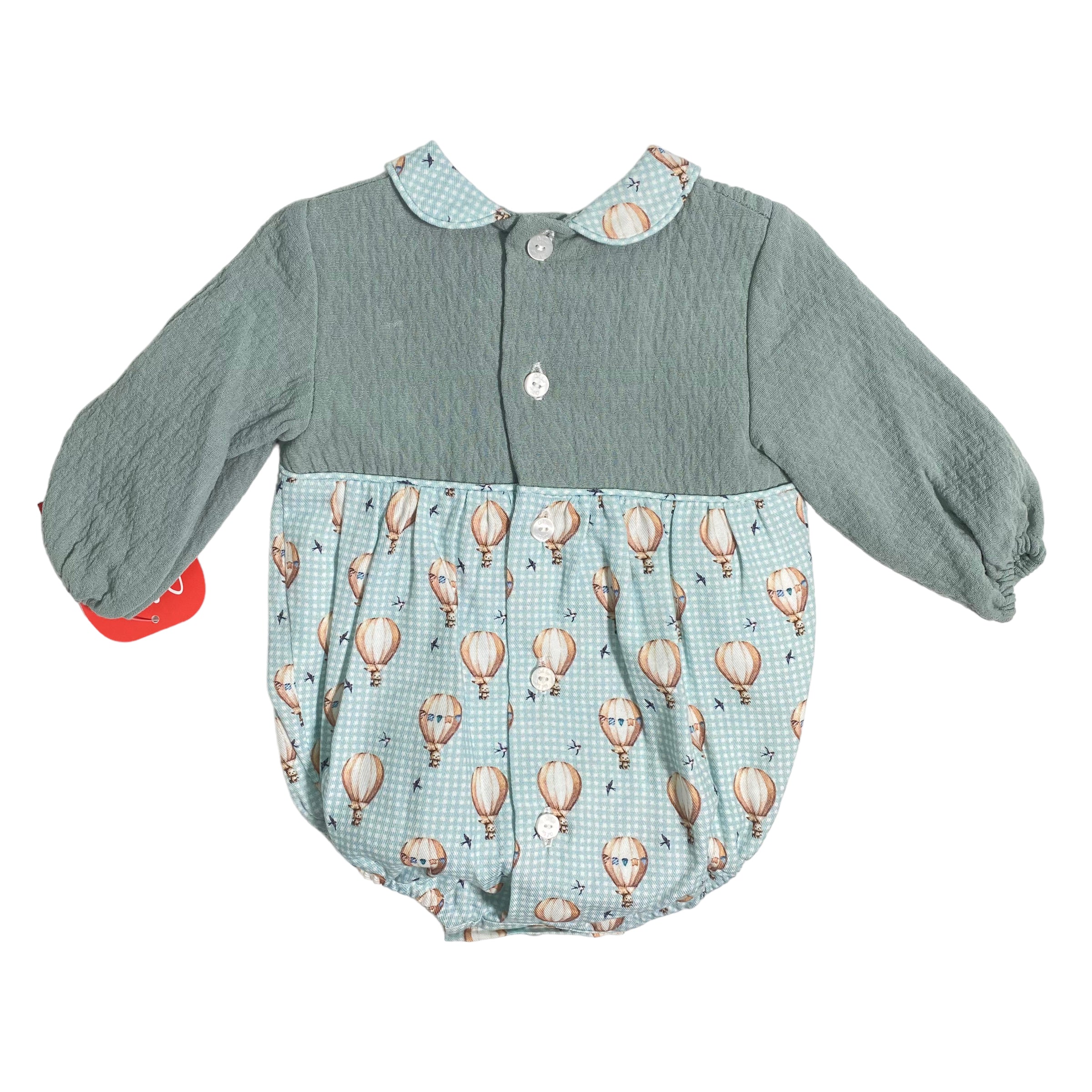Pagliaccetto manica lunga in caldo cotone, con colletto tondo e fantasia mongolfiere.