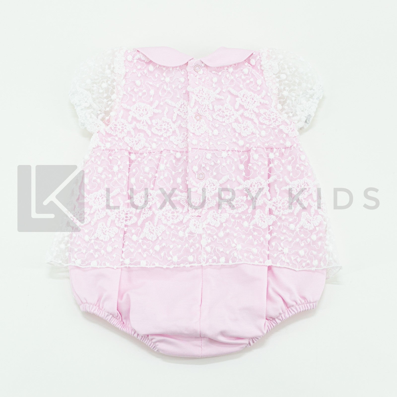 Half Sleeve Romper In Pink Cotton With White Embroidered Tulle La Sartoria Dei Piccoli LP756