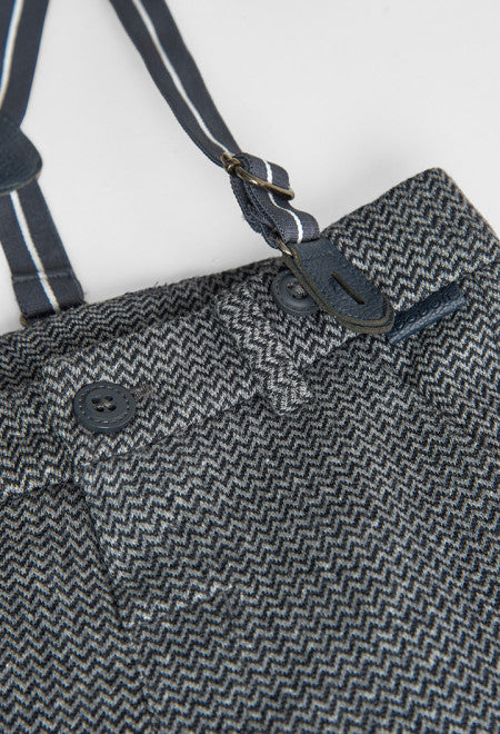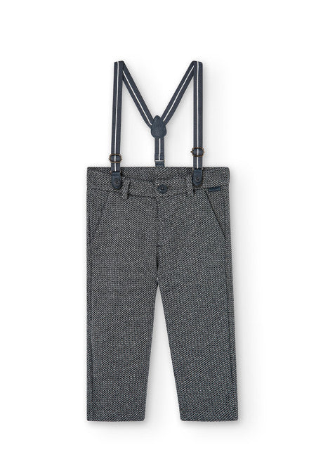 Pantalone lungo in caldo cotone elasticizzato, in microfantasia, con bretelle.