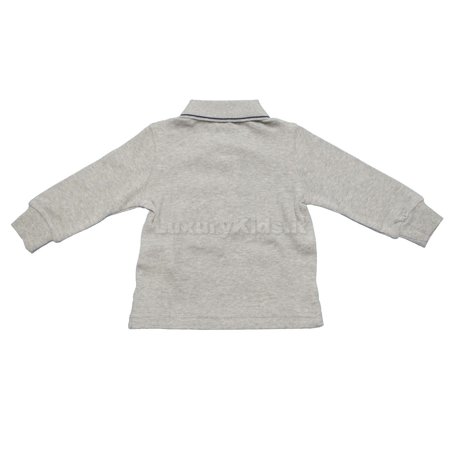 Solid color polo shirt in warm gray cotton with blue stripes on the collar and button closure