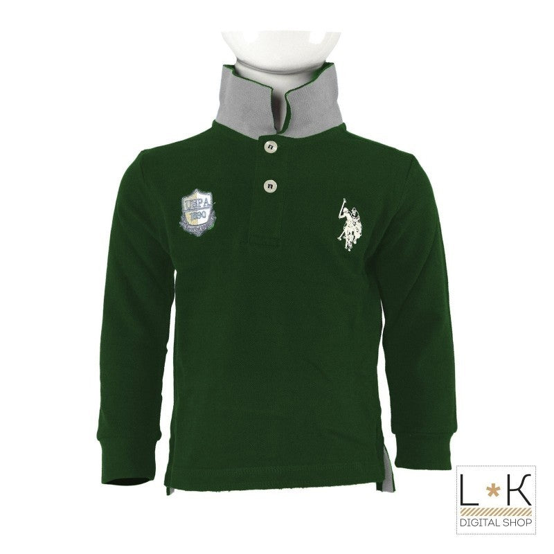 Warm green cotton long sleeve polo shirt with embroidery on the chest and button closure