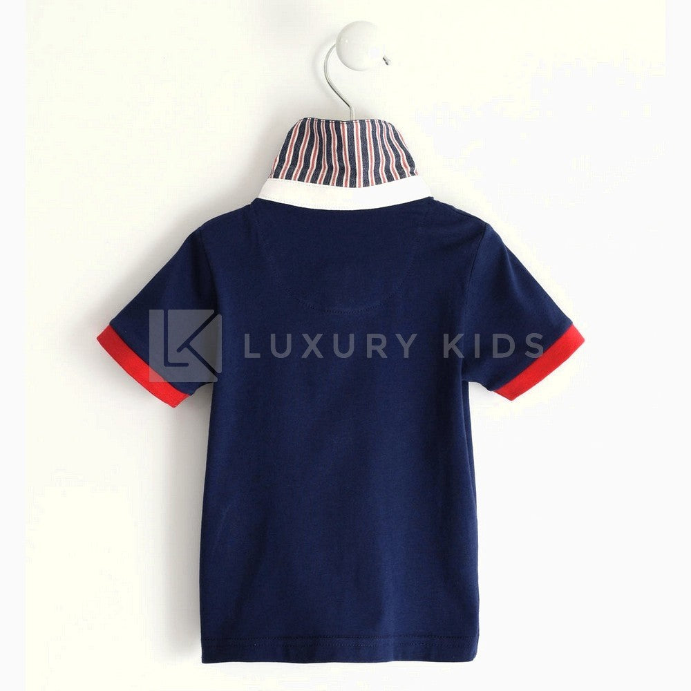 Practical Sarabanda polo shirt made of 100% cotton jersey. Very nice pocket made of striped fabric, in combination with the under collar. Contrasting elastic rib on the sleeve bottom