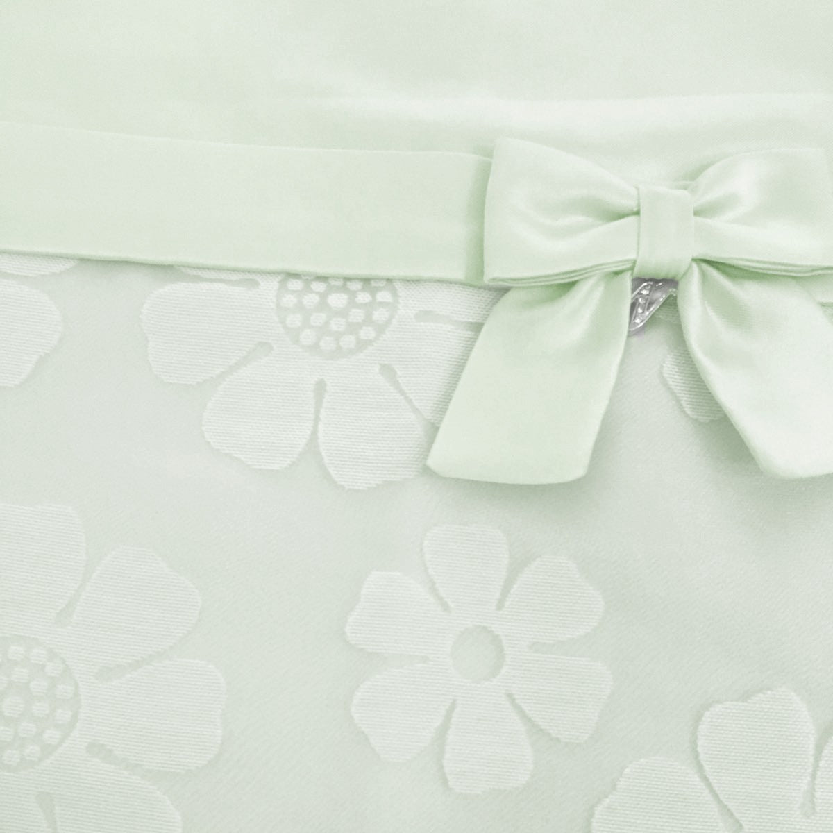 Solid color green satin sack with organza layer embroidered with white flowers and band with bow applied to the center