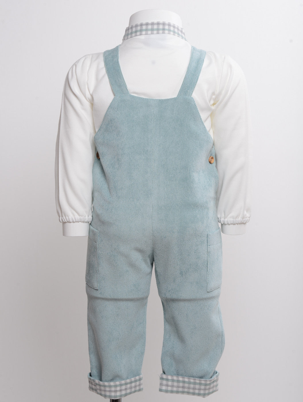 Velvet dungarees with side pockets and shirt with checked collar.
