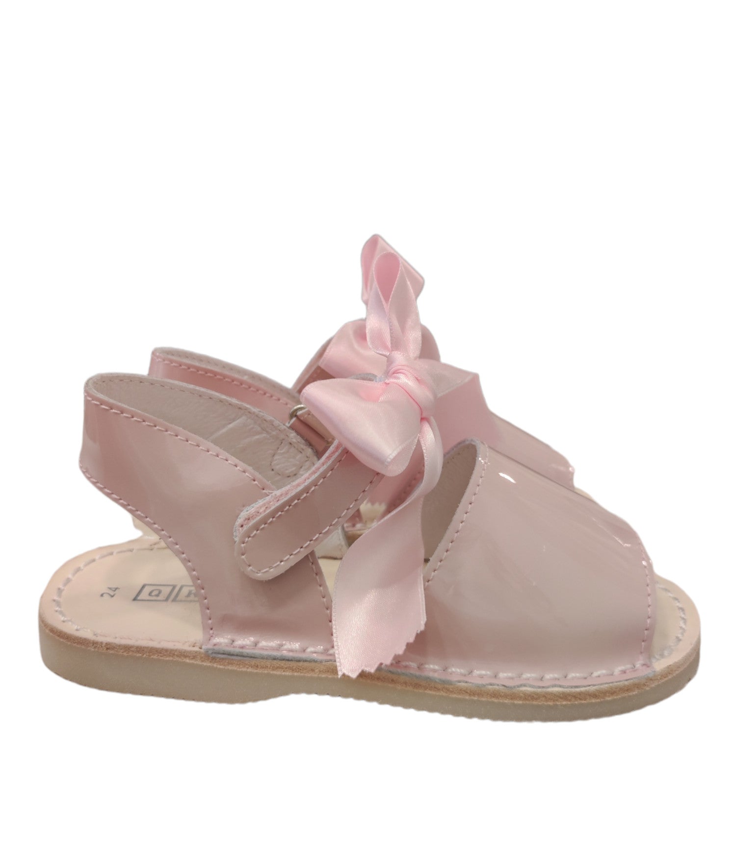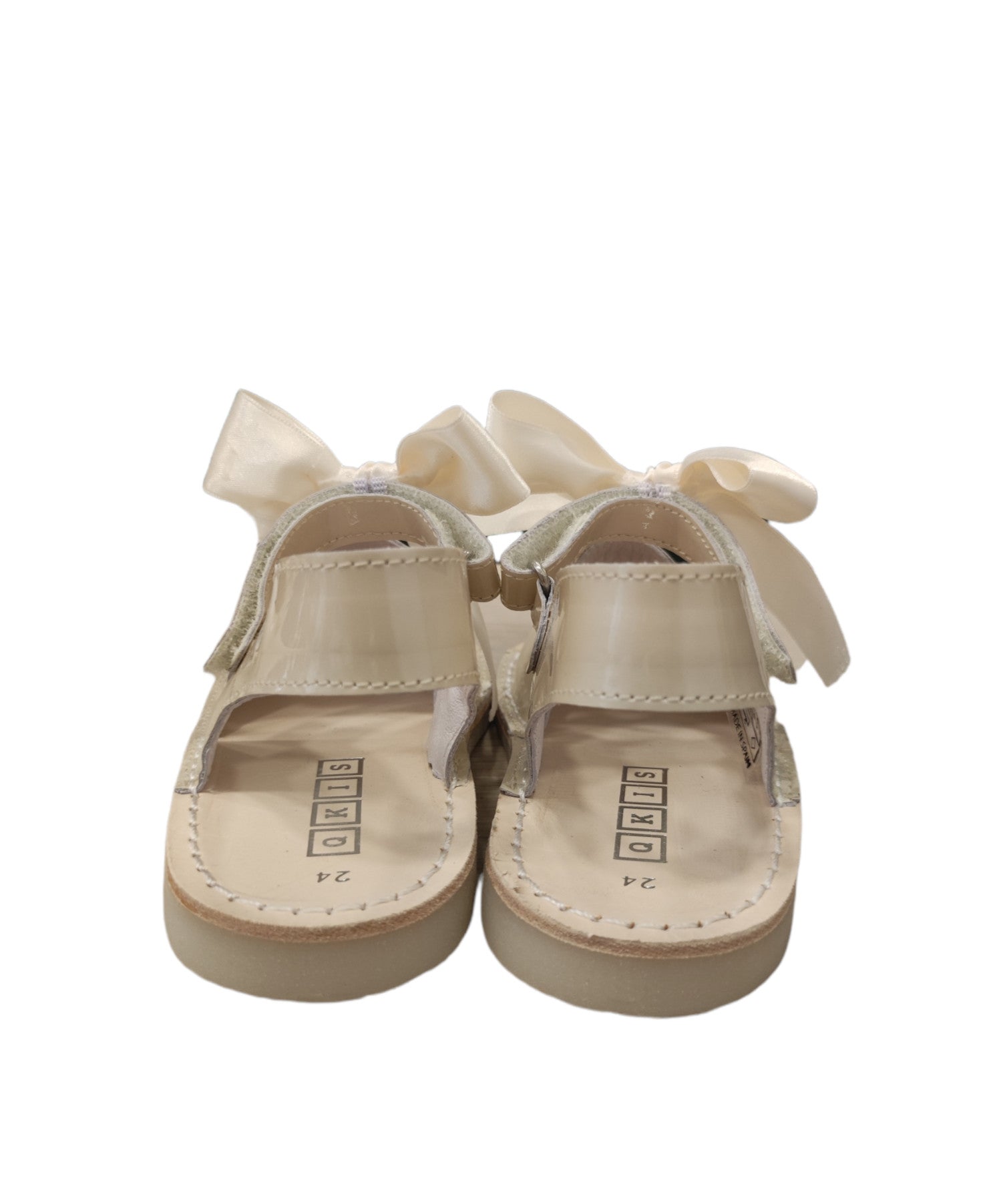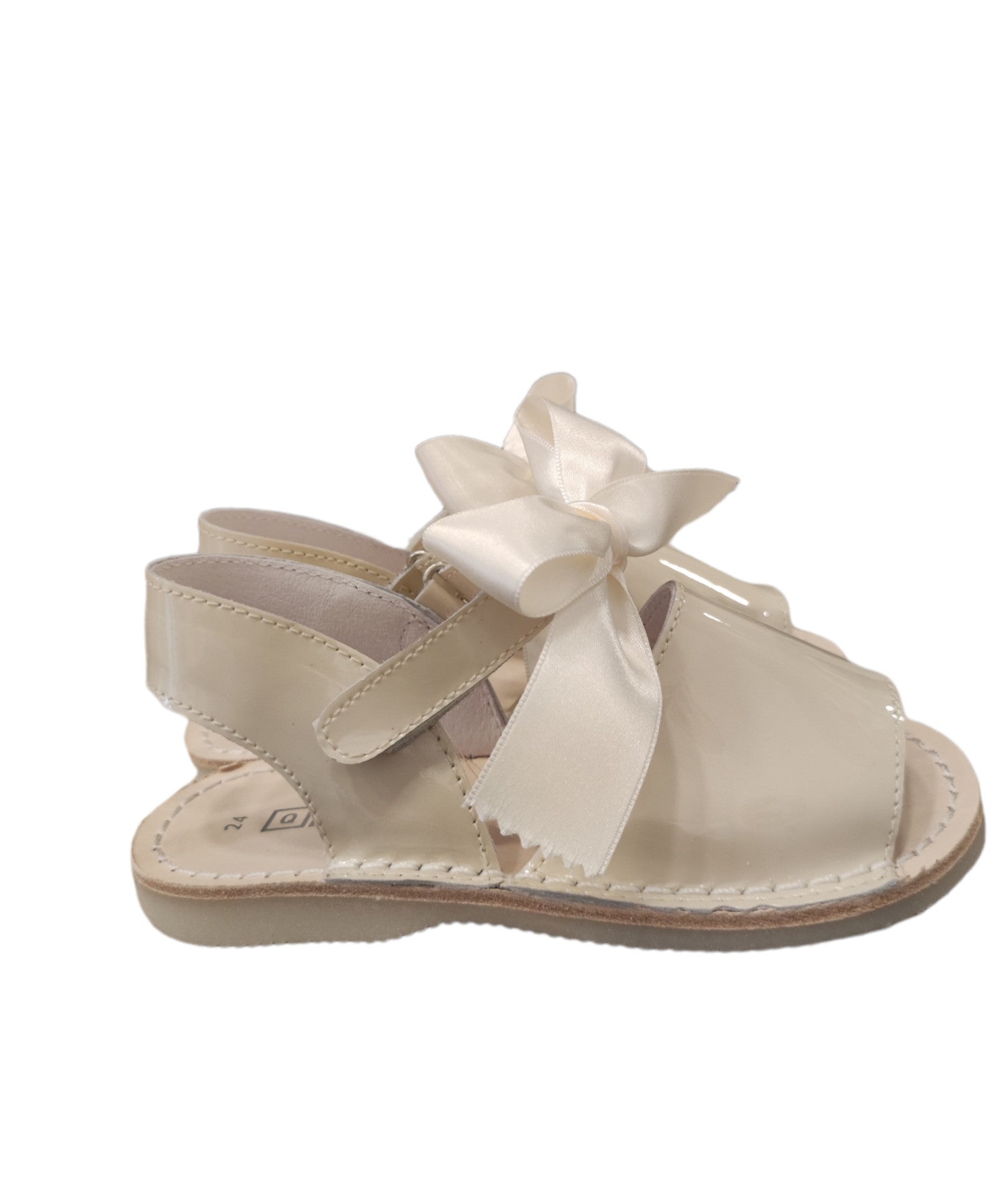 Cream shiny leather sandals, Opening on the instep with a tear and embellished with a satin bow. Front opening