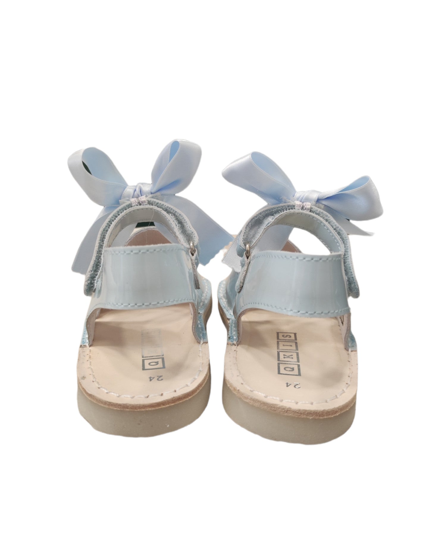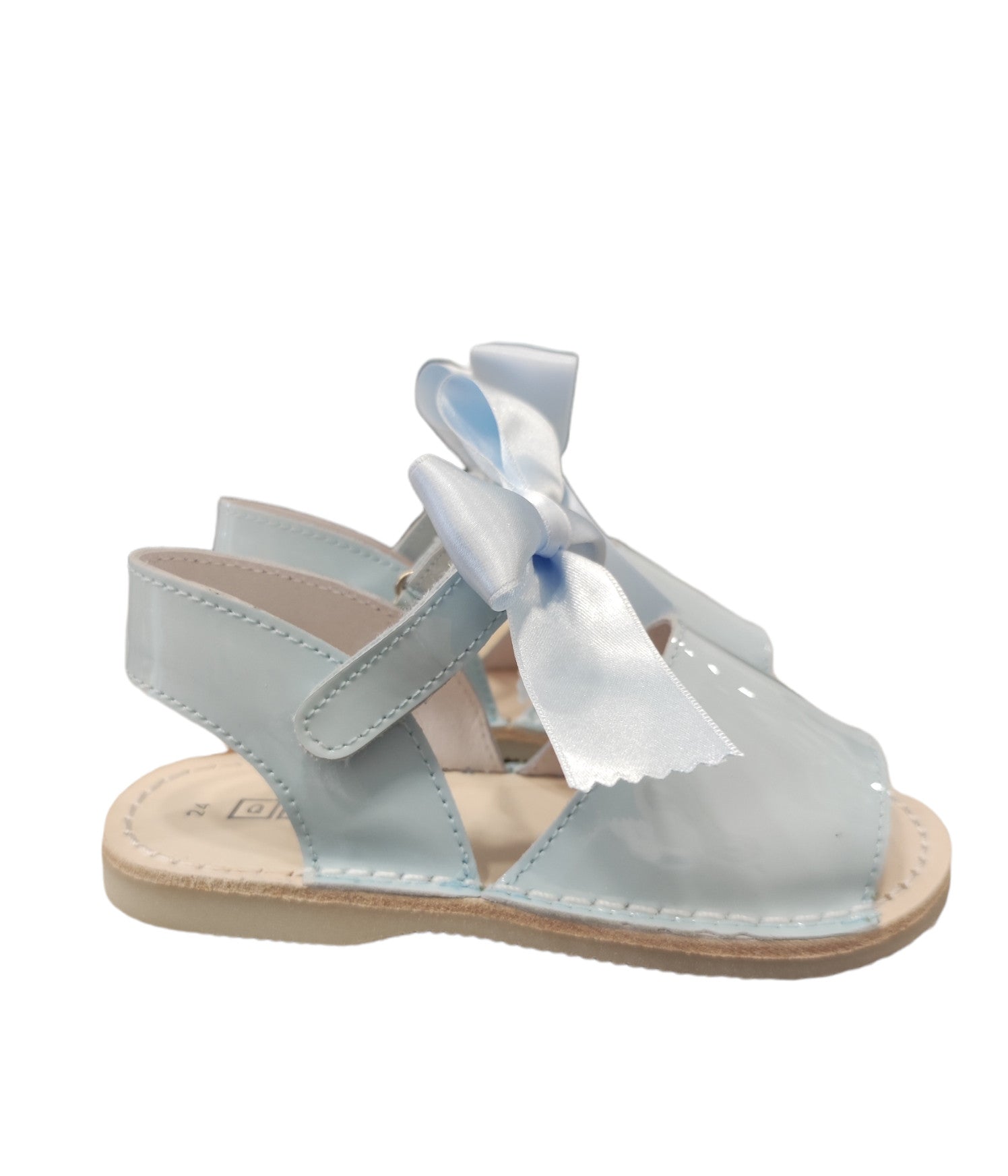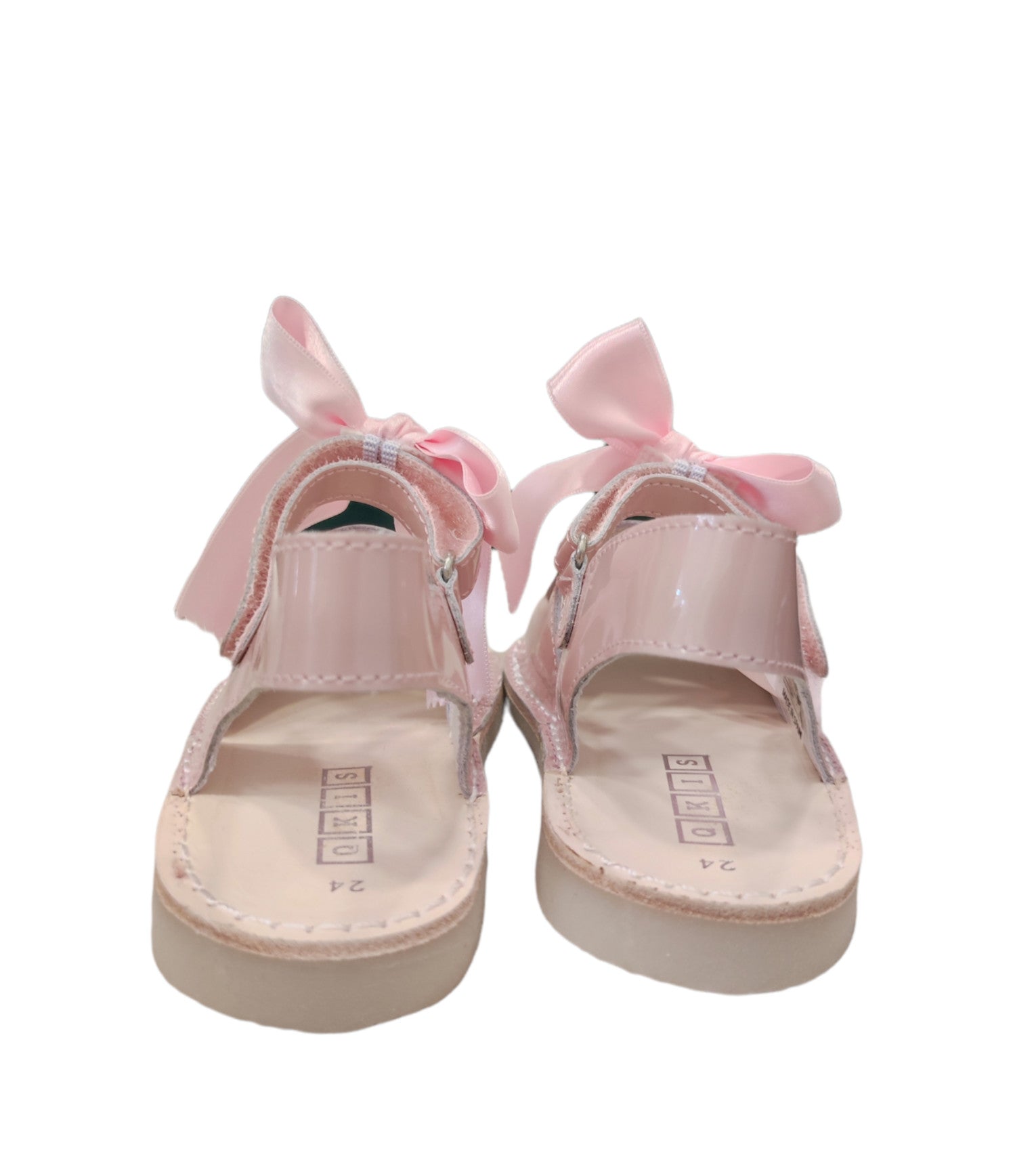 Cream shiny leather sandals, Opening on the instep with a tear and embellished with a satin bow. Front opening