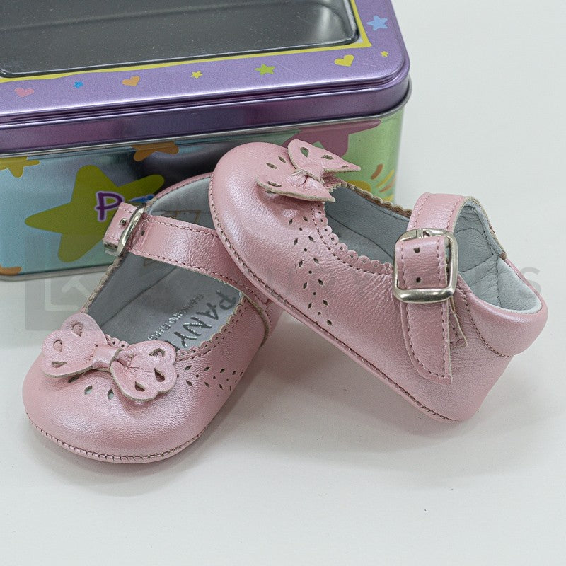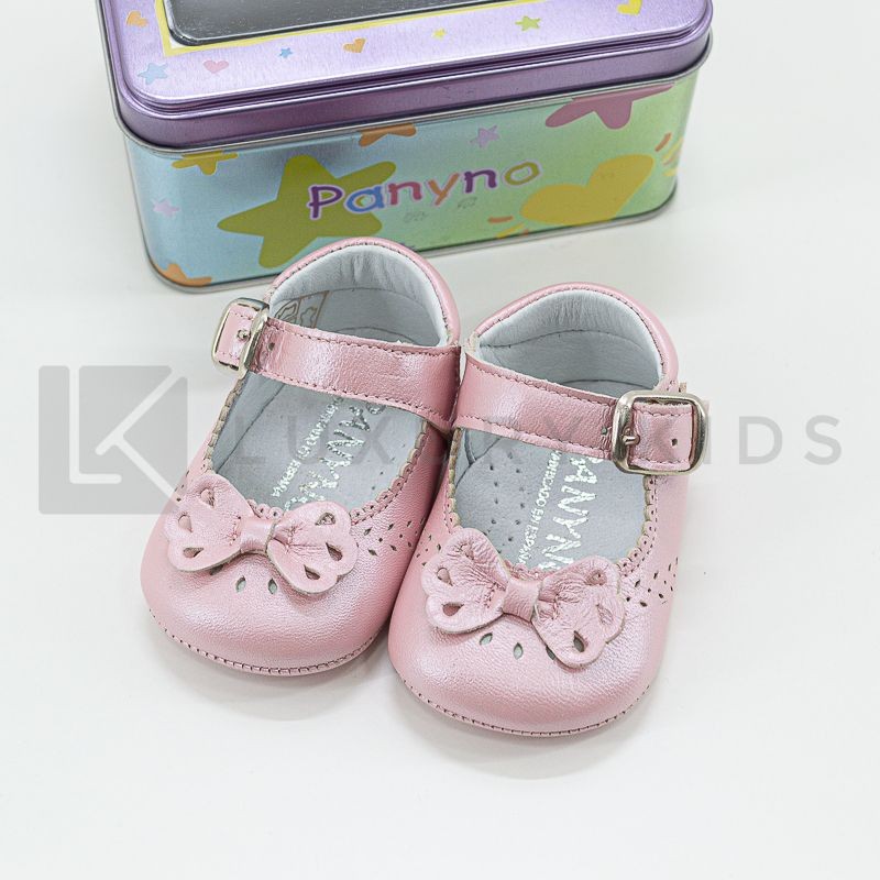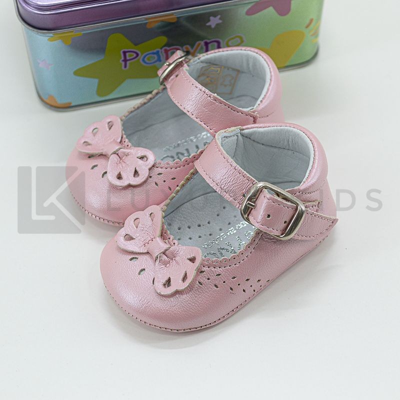 Cradle shoe in satin leather with bow on the front and buckle closure.