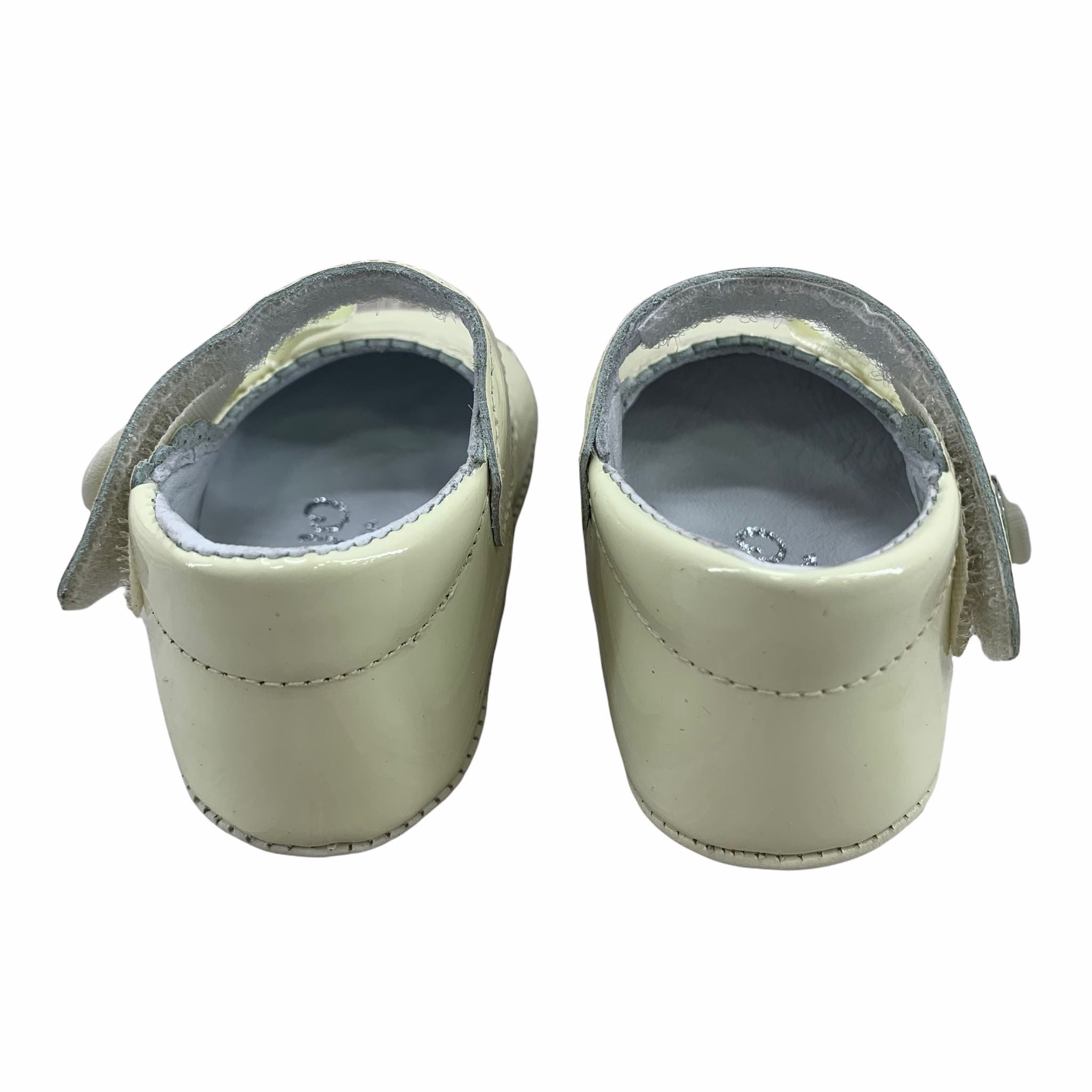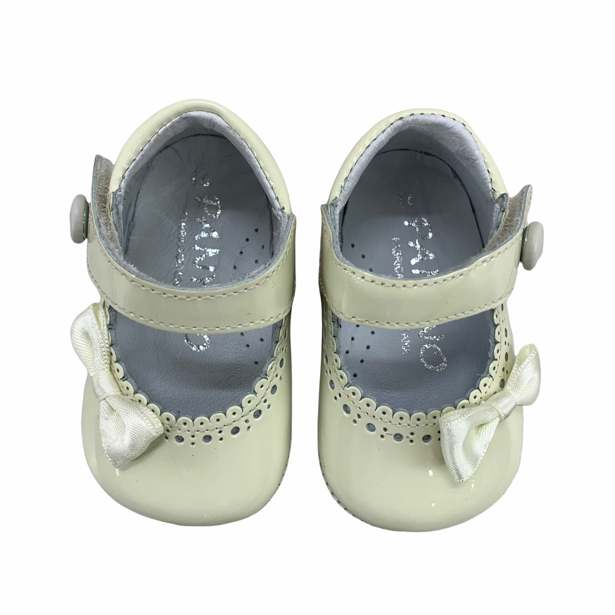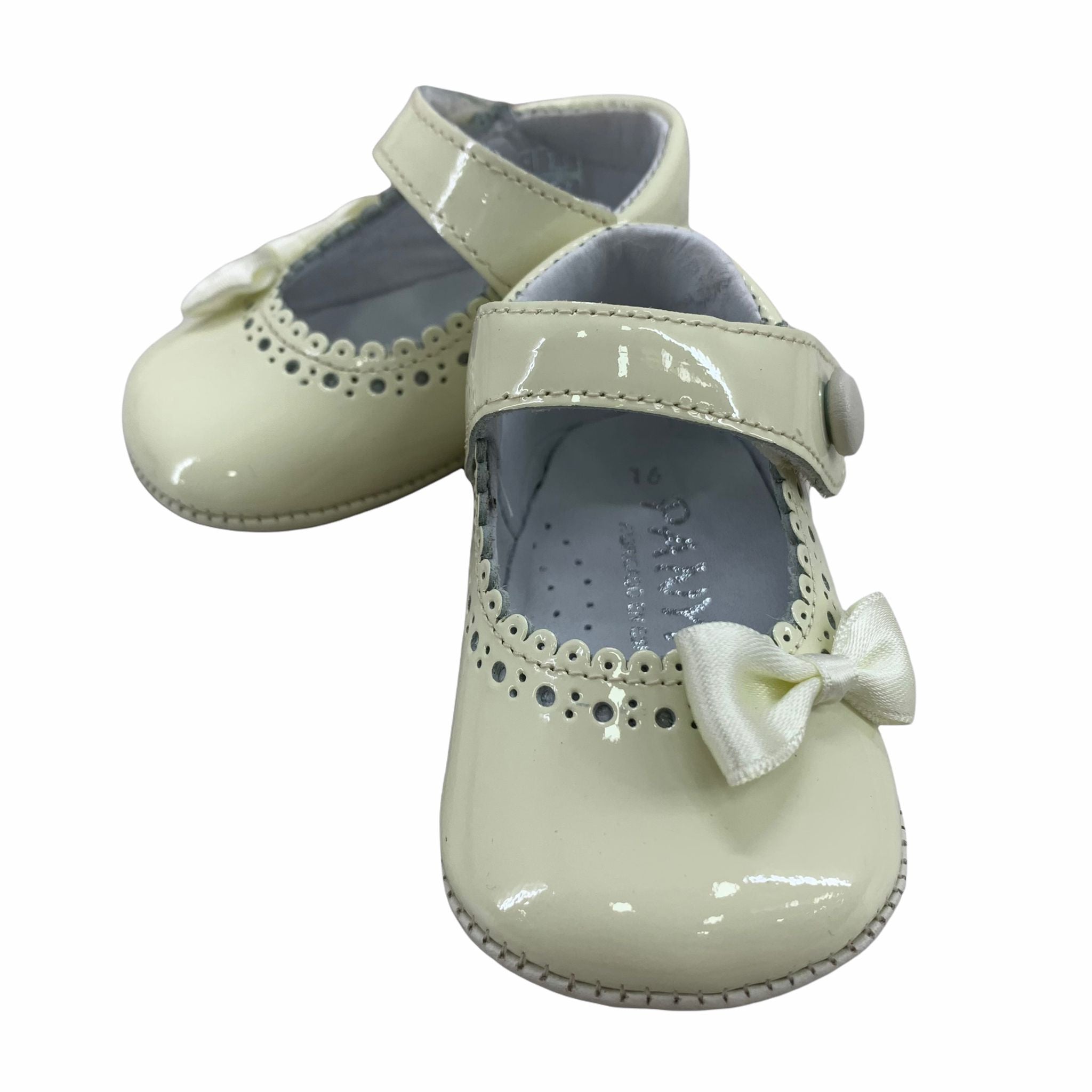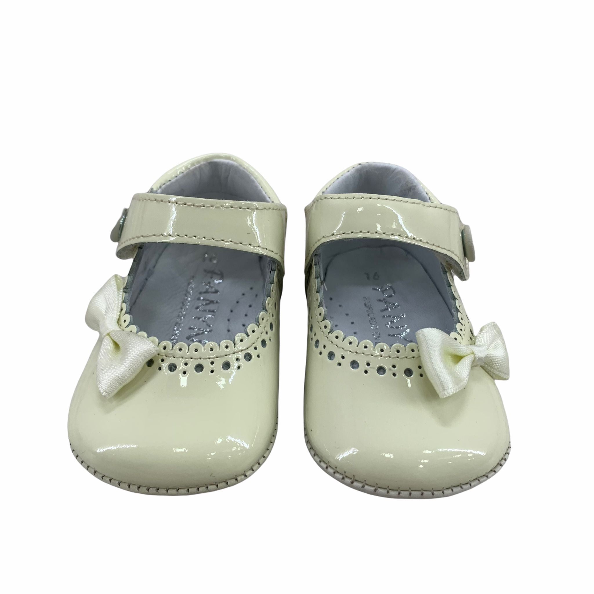 Patent leather cradle shoes, ballerina model with bow on the side.