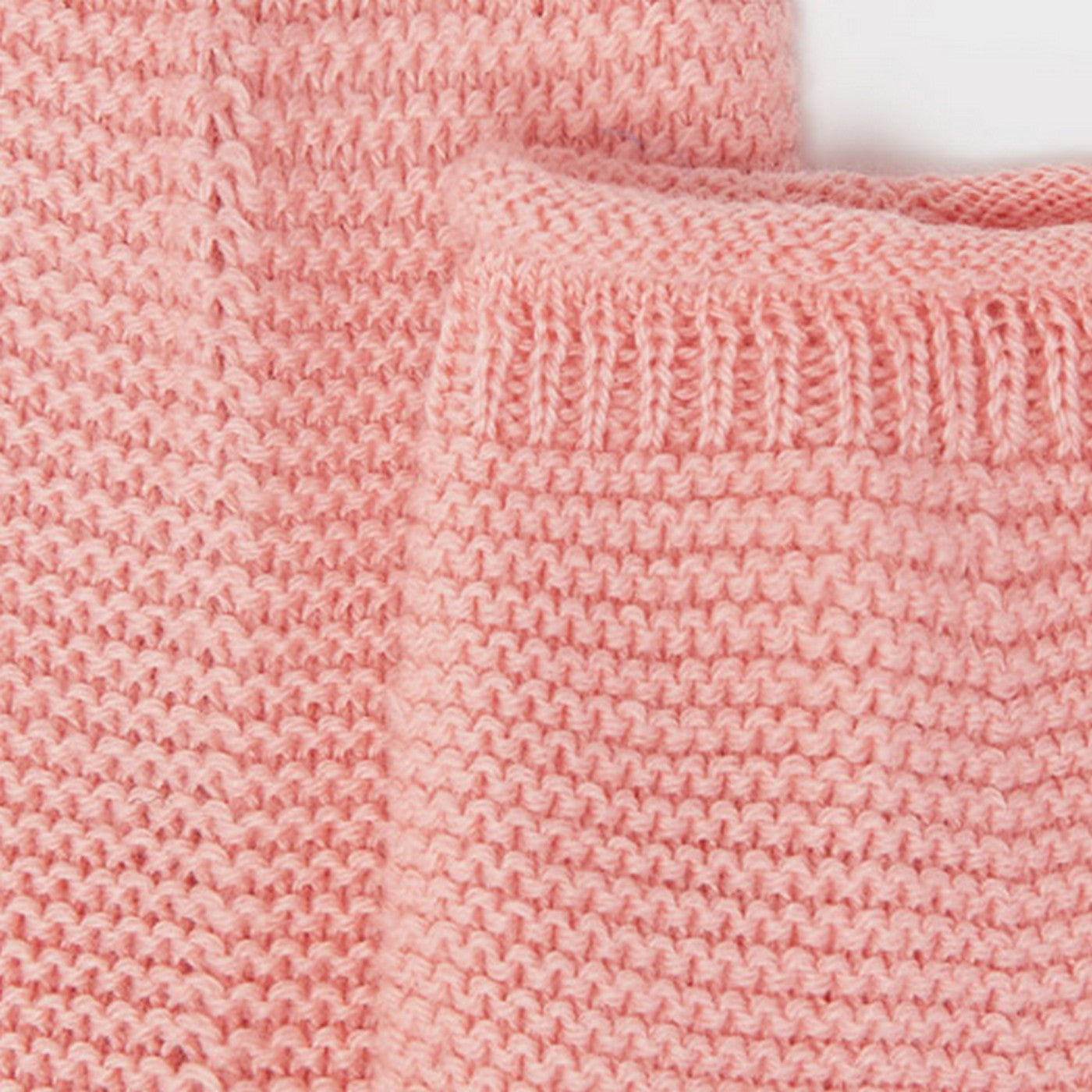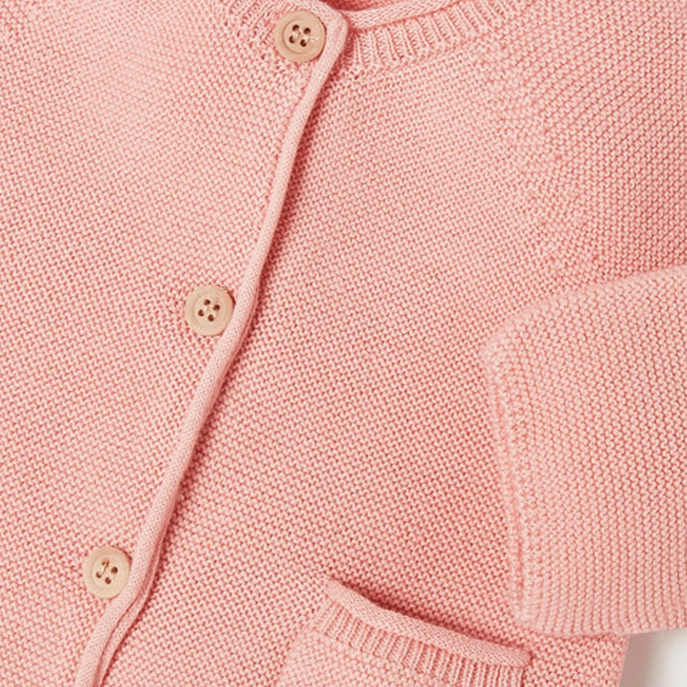 -Cardigan in plain pink cotton thread with pockets on the front and closure with wooden buttons.