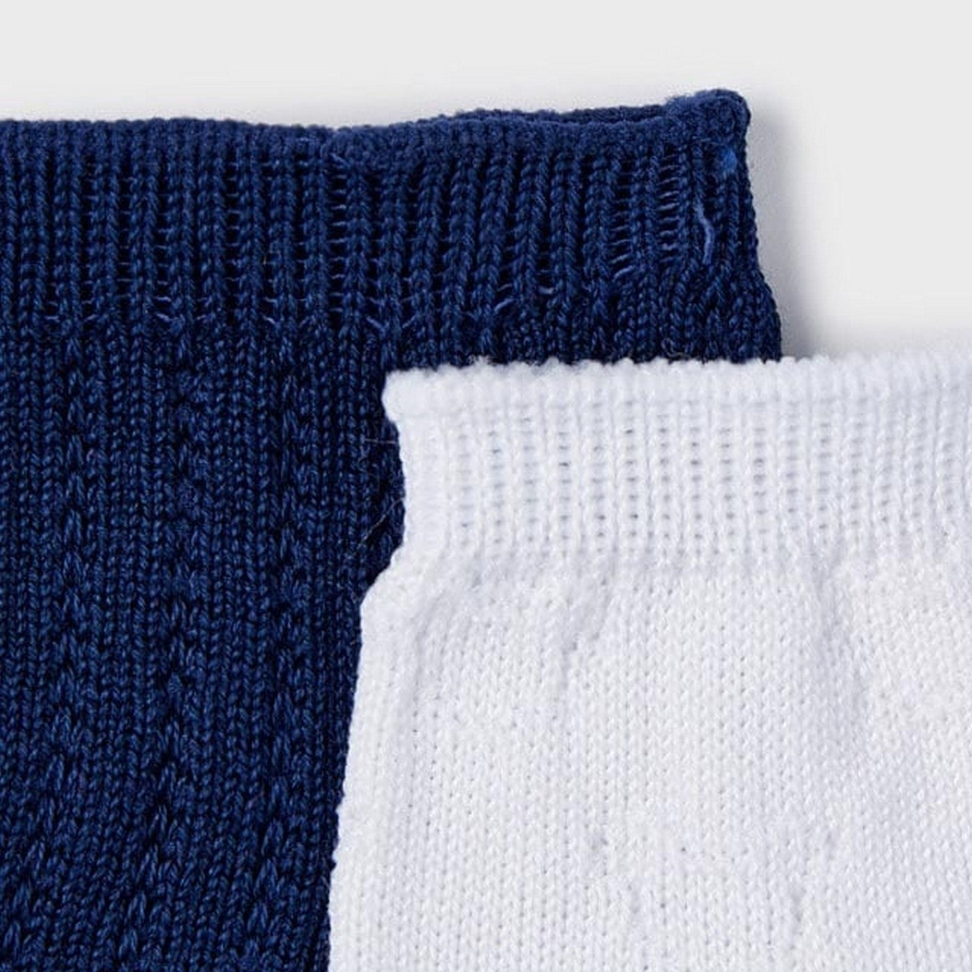 Two pairs of short socks, one white and one blue, in cotton with teddy bear perforations.
