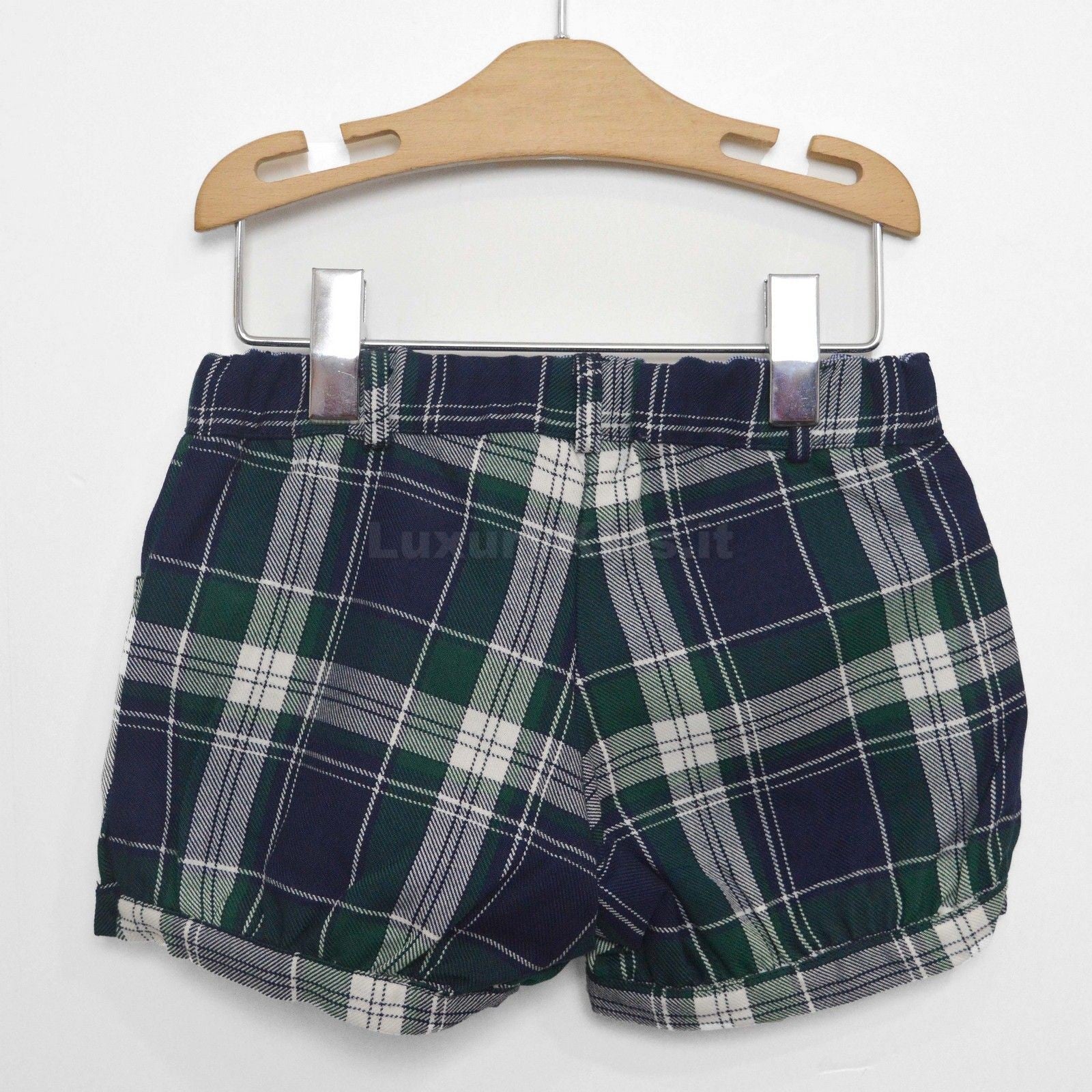 -Short in warm cotton with green and blue checked pattern with green velvet bow applied on the front