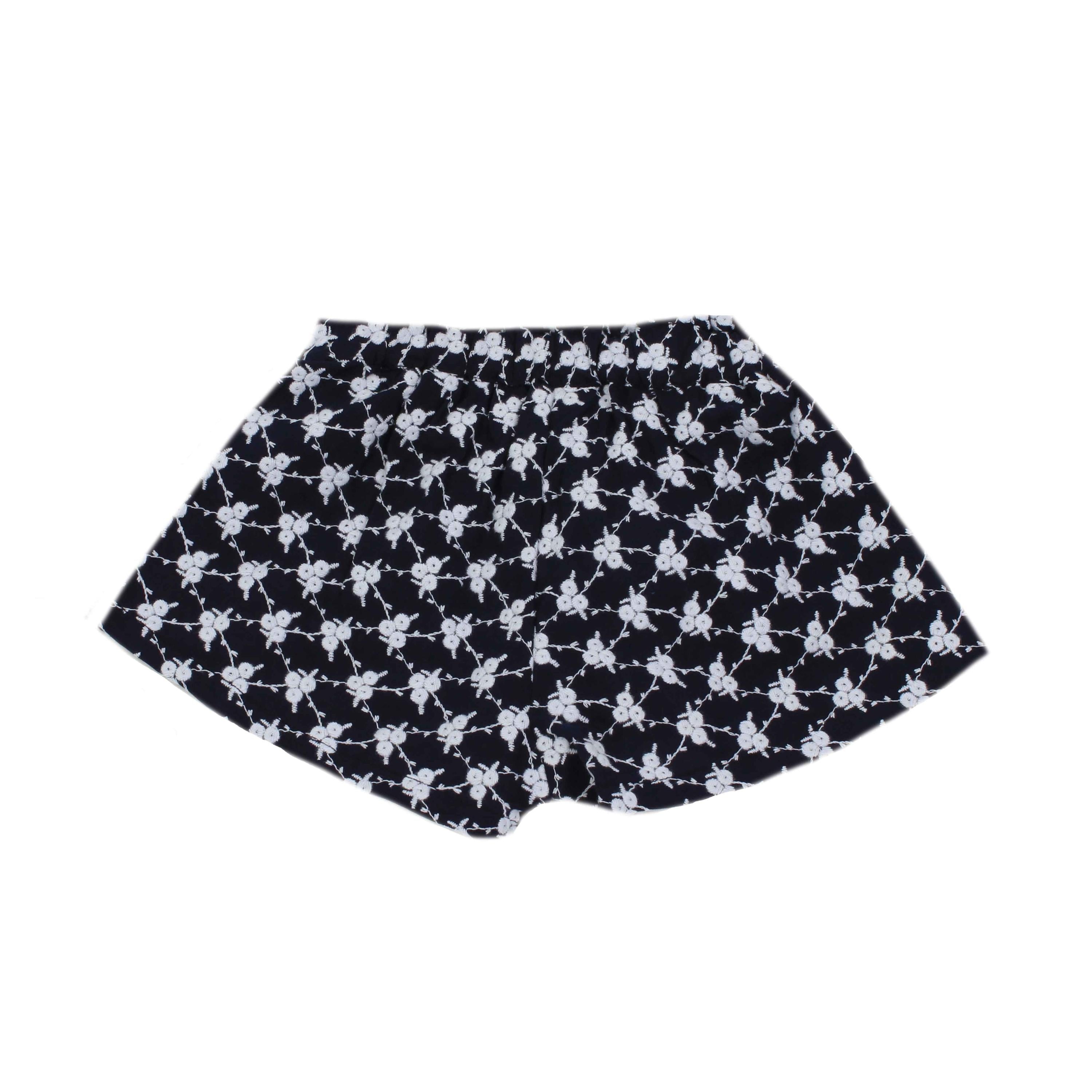 Blue Cotton Shorts With White Embossed Flower Embroidery. Adjustable elastic waist, with tassel at the end of the lace in turquoise.