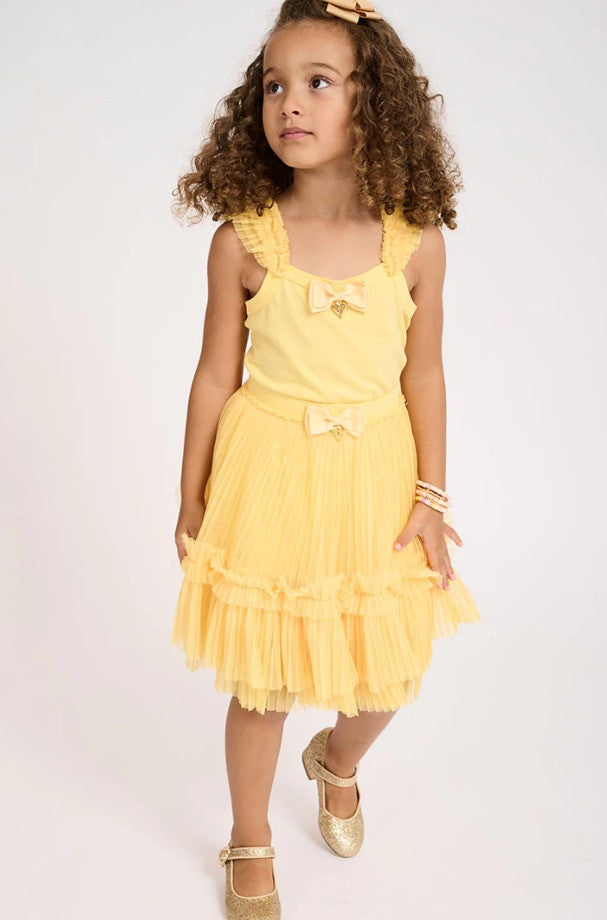 Crafted from the softest cotton blend in sunny yellow, complete with our signature bow and gold heart-shaped charm in the center of the neckline.